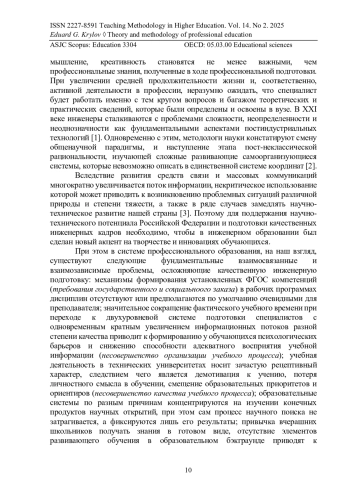 Методология инженерного образования в отношении целей, подходов, задач в настоящее время претерпевает существенную трансформацию. Метапредметные, когнитивные навыки, критическое мышление, креативность становятся не менее важными, чем профессиональные знания, полученные в ходе профессиональной подготовки. При увеличении средней продолжительности жизни и, соответственно, активной деятельности в профессии, неразумно ожидать, что специалист будет работать именно с тем кругом вопросов и багажом теоретических и практических сведений, которые были определены и освоены в вузе. В XXI веке инженеры сталкиваются с проблемами сложности, неопределенности и неоднозначности как фундаментальными аспектами постиндустриальных технологий [1]. Одновременно с этим, методологи науки констатируют смену общенаучной парадигмы, и наступление этапа пост-неклассической рациональности, изучающей сложные развивающие самоорганизующиеся системы, которые невозможно описать в единственной системе координат