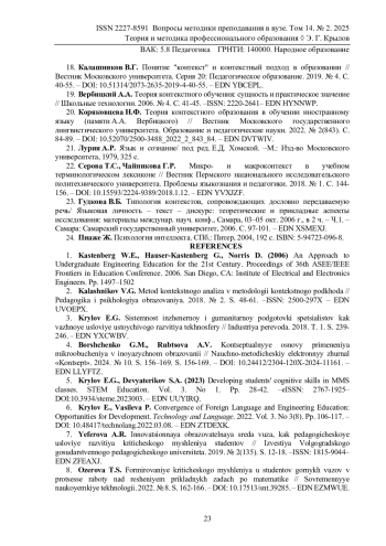 2. Калашников В.Г. Метод контекстного анализа в методологии контекстного подхода // Педагогика и психология образования. 2018. № 2. С. 48-61. -ISSN: 2500-297X. EDN: UVOEPX