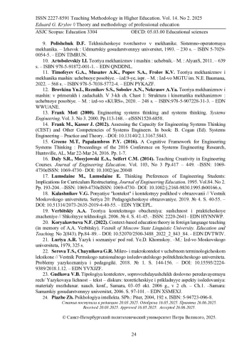 5. Krylov E.G., Devyaterikov S.A. (2023) Developing students’ cognitive skills in MMS classes. STEM Education. Vol. 3. No 1. Pp. 28-42. -eISSN: 2767-1925-. DOI: 10.3934/steme.2023003 EDN: UUYIRQ