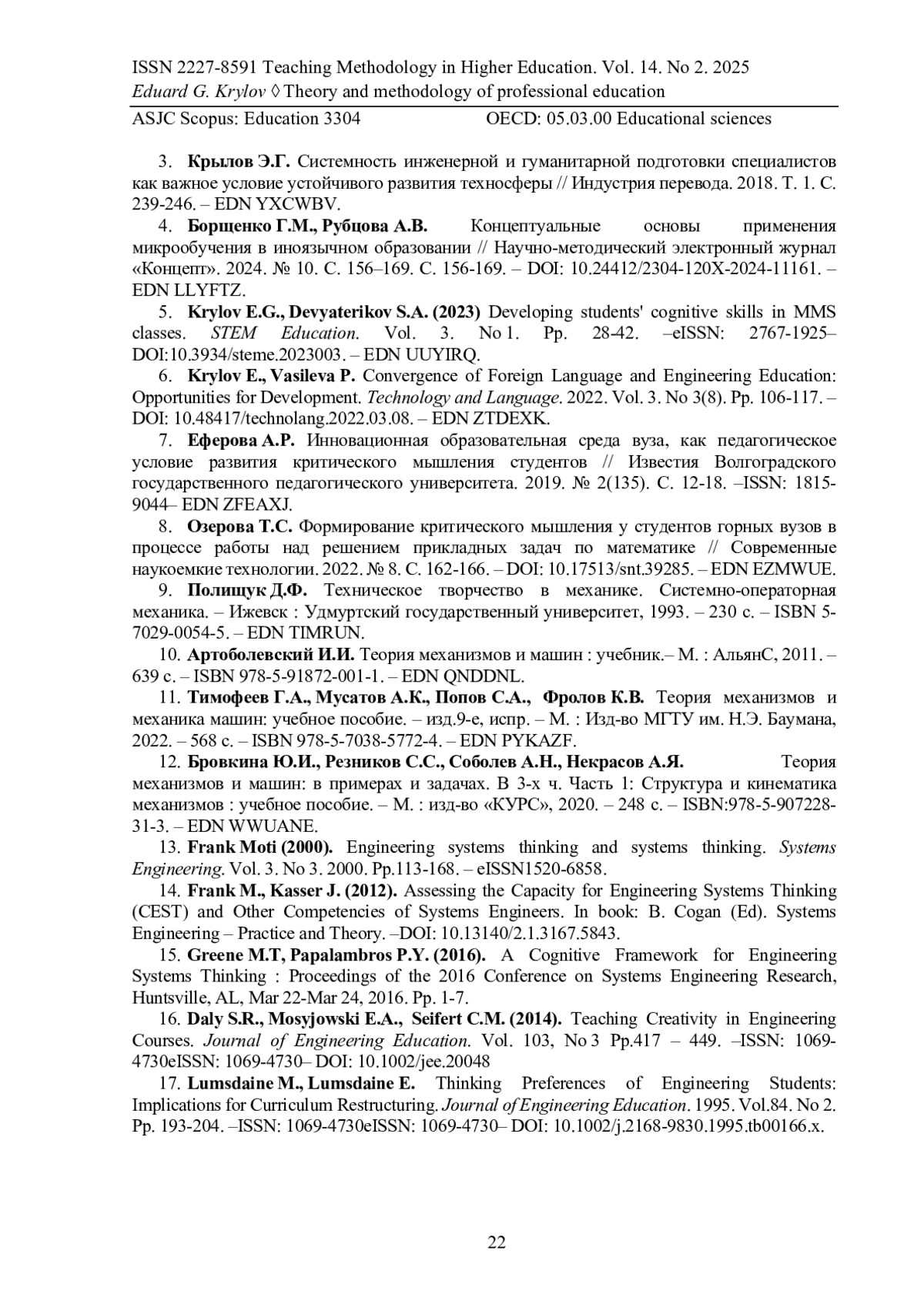 3. Крылов Э.Г. Системность инженерной и гуманитарной подготовки специалистов как важное условие устойчивого развития техносферы // Индустрия перевода. 2018. Т. 1. С. 239-246. EDN: YXCWBV