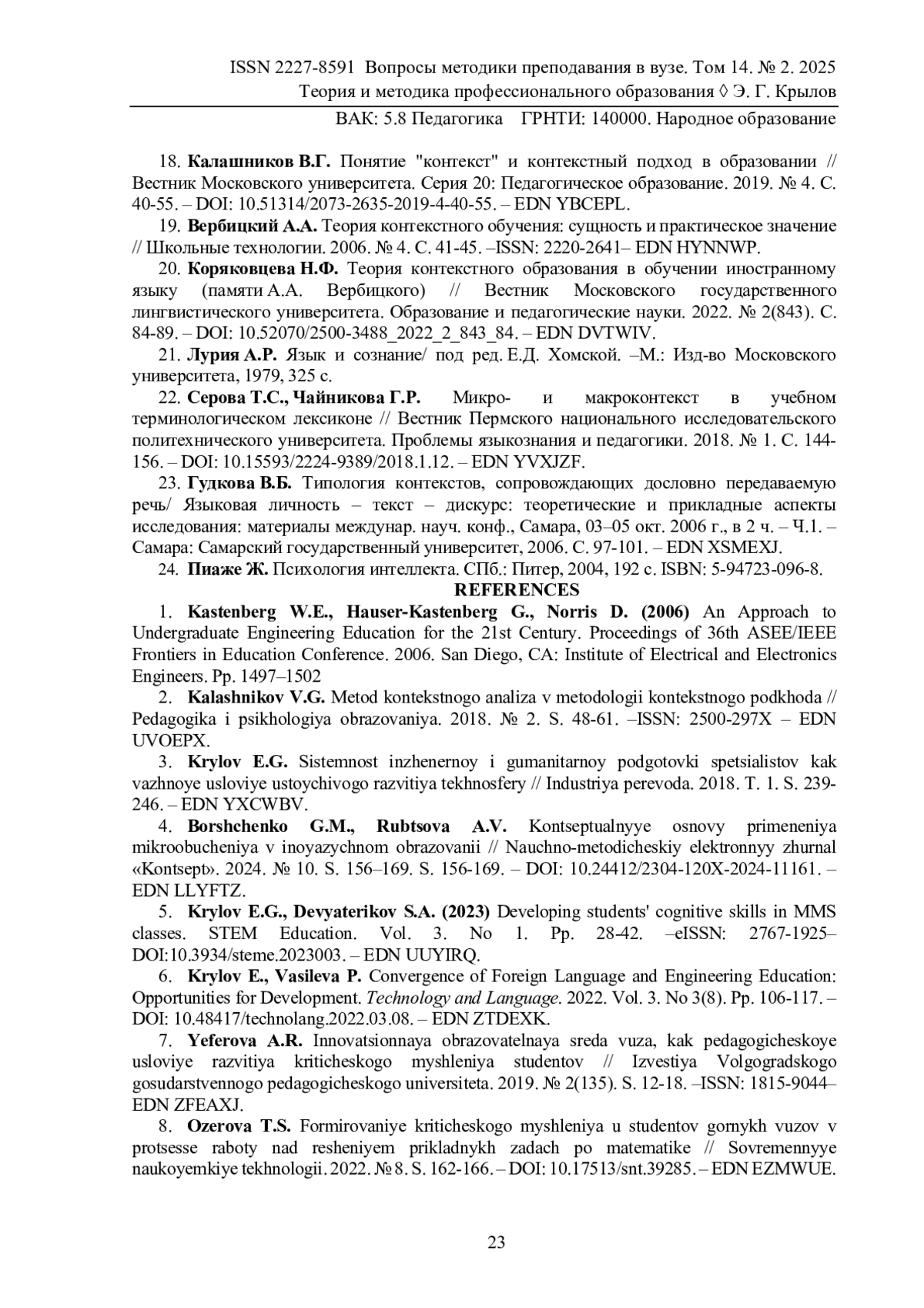 18. Калашников В.Г. Понятие “контекст” и контекстный подход в образовании // Вестник Московского университета. Серия 20: Педагогическое образование. 2019. № 4. С. 40-55. -. DOI: 10.51314/2073-2635-2019-4-40-55 EDN: YBCEPL