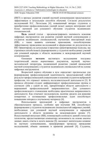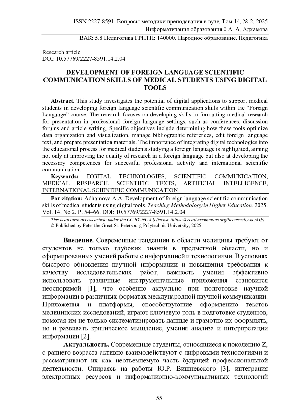 Введение. Современные тенденции в области медицины требуют от студентов не только глубоких знаний в предметной области, но и сформированных умений работы с информацией и технологиями. В условиях быстрого обновления научной информации и повышения требования к качеству исследовательских работ, важность умения эффективно использовать различные инструментальные приложения становится неоспоримой [1], что особенно актуально при подготовке научной информации в различных форматах международной научной коммуникации. Приложения и платформы, способствующие оформлению текстов медицинских исследований, играют ключевую роль в подготовке студентов, помогая им не только систематизировать данные и грамотно их оформлять, но и развивать критическое мышление, умения анализа и интерпретации информации