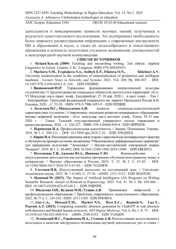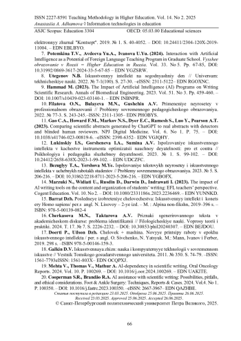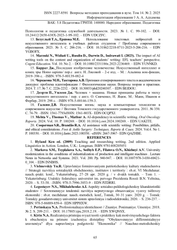 7. Потемкина Т.В., Авдеева Ю.А., Иванова У.Ю. Взаимодействие с искусственным интеллектом как потенциал программы обучения иностранному языку в аспирантуре // Высшее образование в России. 2024. Т. 33. № 5. С. 67-85. -. DOI: 10.31992/0869-3617-2024-33-5-67-85 EDN: YGZSRW