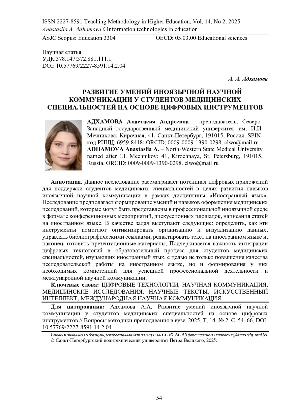 Данное исследование рассматривает потенциал цифровых приложений для поддержки студентов медицинских специальностей в целях развития навыков иноязычной научной коммуникации в рамках дисциплины «Иностранный язык». Исследование предполагает формирование умений и навыков оформления медицинских исследований, которые могут быть представлены в профессиональной иноязычной среде в формате конференционных мероприятий, дискуссионных площадок, написания статей на иностранном языке. В качестве задач выступают следующие: определить, как эти инструменты помогают оптимизировать организацию и визуализацию данных, управлять библиографическими ссылками, редактировать текст на иностранном языке и, наконец, готовить презентационные материалы. Подчеркивается важность интеграции цифровых технологий в образовательный процесс для студентов медицинских специальностей, изучающих иностранный язык, с целью не только повышения качества исследовательской работы на иностранном языке, но и формирования у них необходимых компетенций для успешной профессиональной деятельности и международной научной коммуникации
