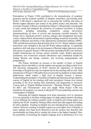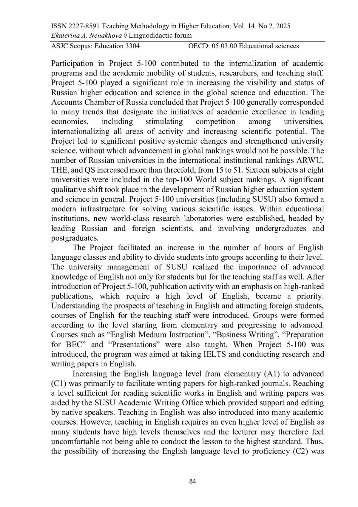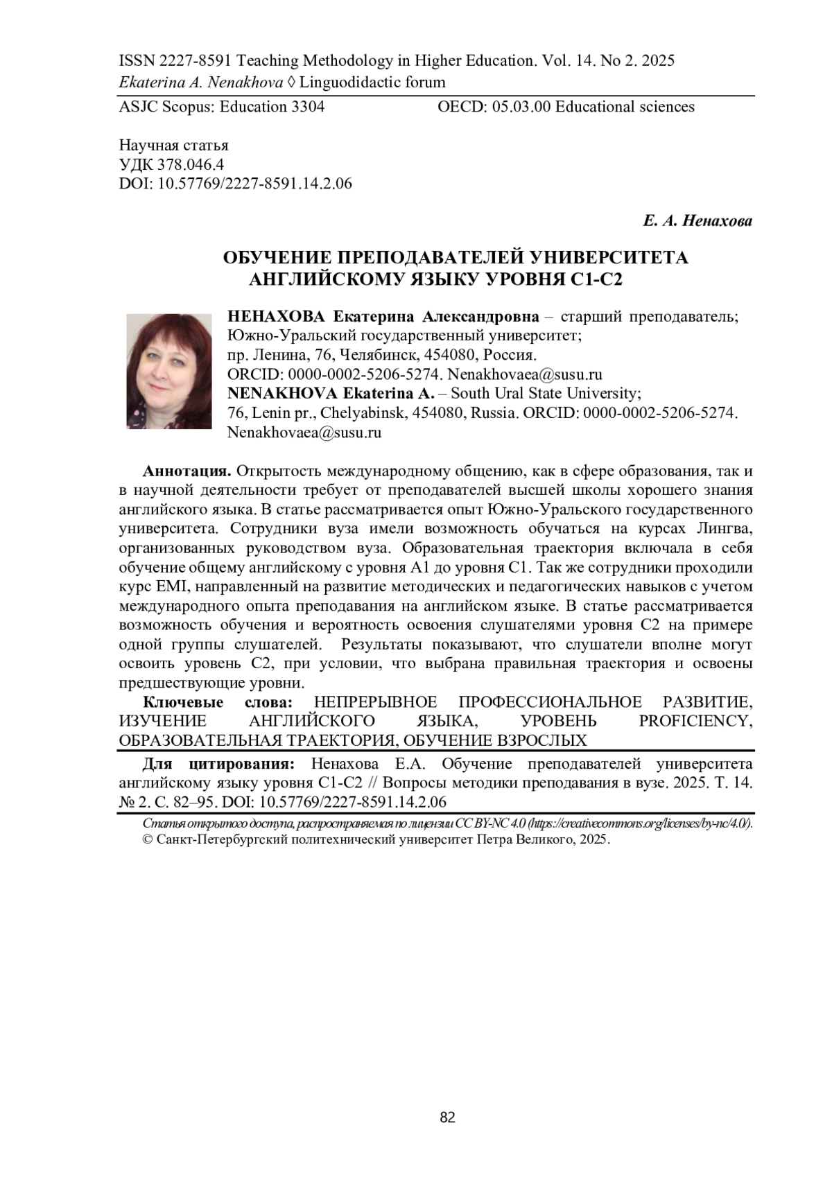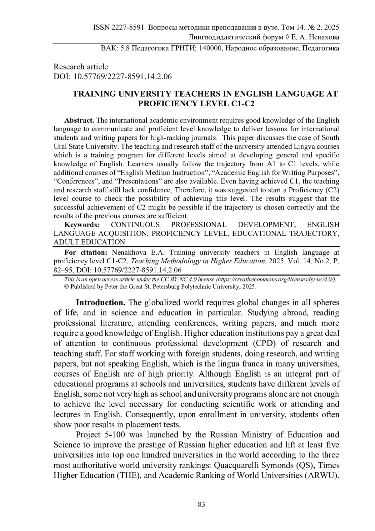Открытость международному общению, как в сфере образования, так и в научной деятельности требует от преподавателей высшей школы хорошего знания английского языка. В статье рассматривается опыт Южно-Уральского государственного университета. Сотрудники вуза имели возможность обучаться на курсах Лингва, организованных руководством вуза. Образовательная траектория включала в себя обучение общему английскому с уровня A1 до уровня С1. Так же сотрудники проходили курс EMI, направленный на развитие методических и педагогических навыков с учетом международного опыта преподавания на английском языке. В статье рассматривается возможность обучения и вероятность освоения слушателями уровня C2 на примере одной группы слушателей. Результаты показывают, что слушатели вполне могут освоить уровень C2, при условии, что выбрана правильная траектория и освоены предшествующие уровни