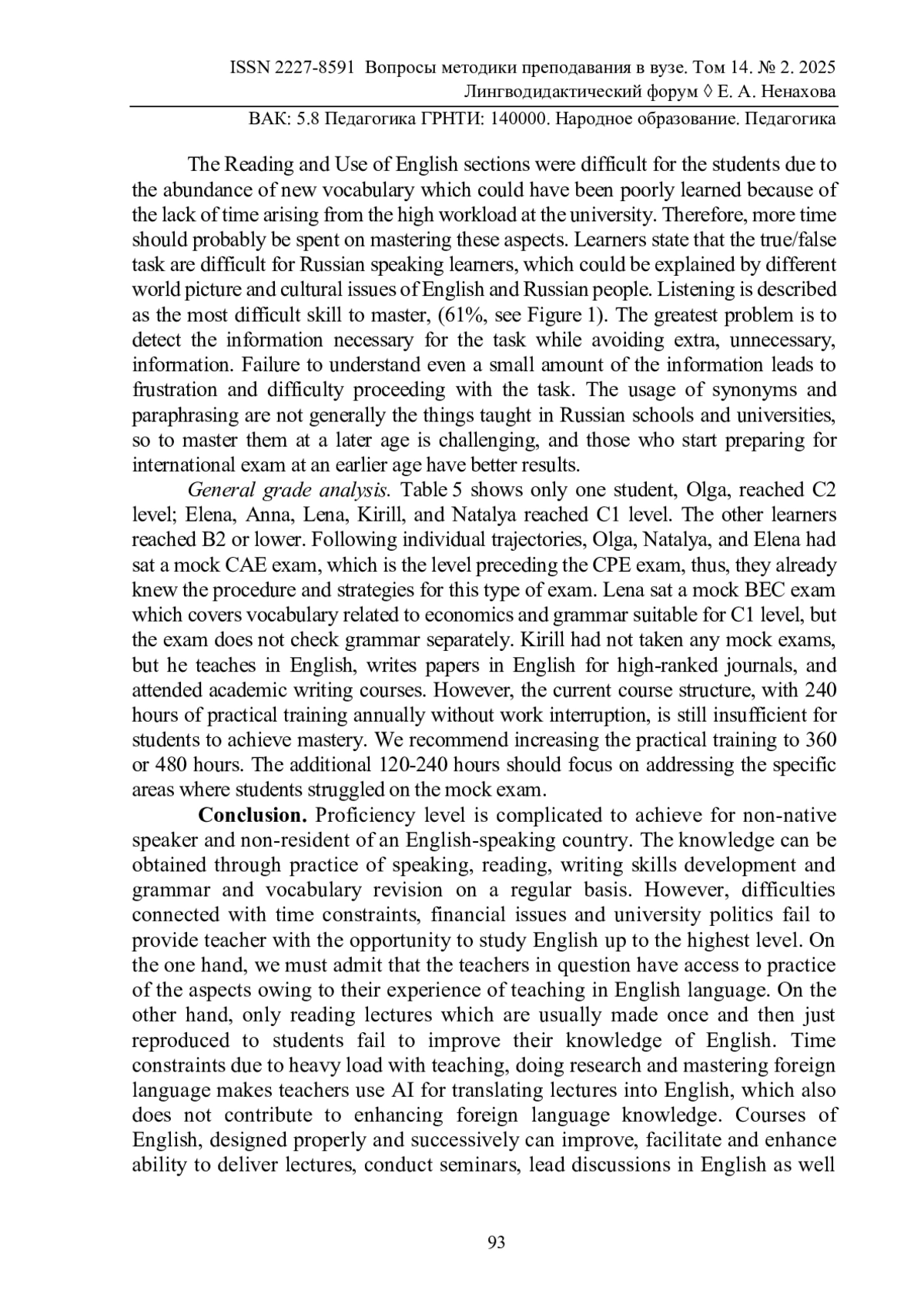 Introduction. The globalized world requires global changes in all spheres of life, and in science and education in particular. Studying abroad, reading professional literature, attending conferences, writing papers, and much more require a good knowledge of English. Higher education institutions pay a great deal of attention to continuous professional development (CPD) of research and teaching staff. For staff working with foreign students, doing research, and writing papers, but not speaking English, which is the lingua franca in many universities, courses of English are of high priority. Although English is an integral part of educational programs at schools and universities, students have different levels of English, some not very high as school and university programs alone are not enough to achieve the level necessary for conducting scientific work or attending and lectures in English. Consequently, upon enrollment in university, students often show poor results in placement tests