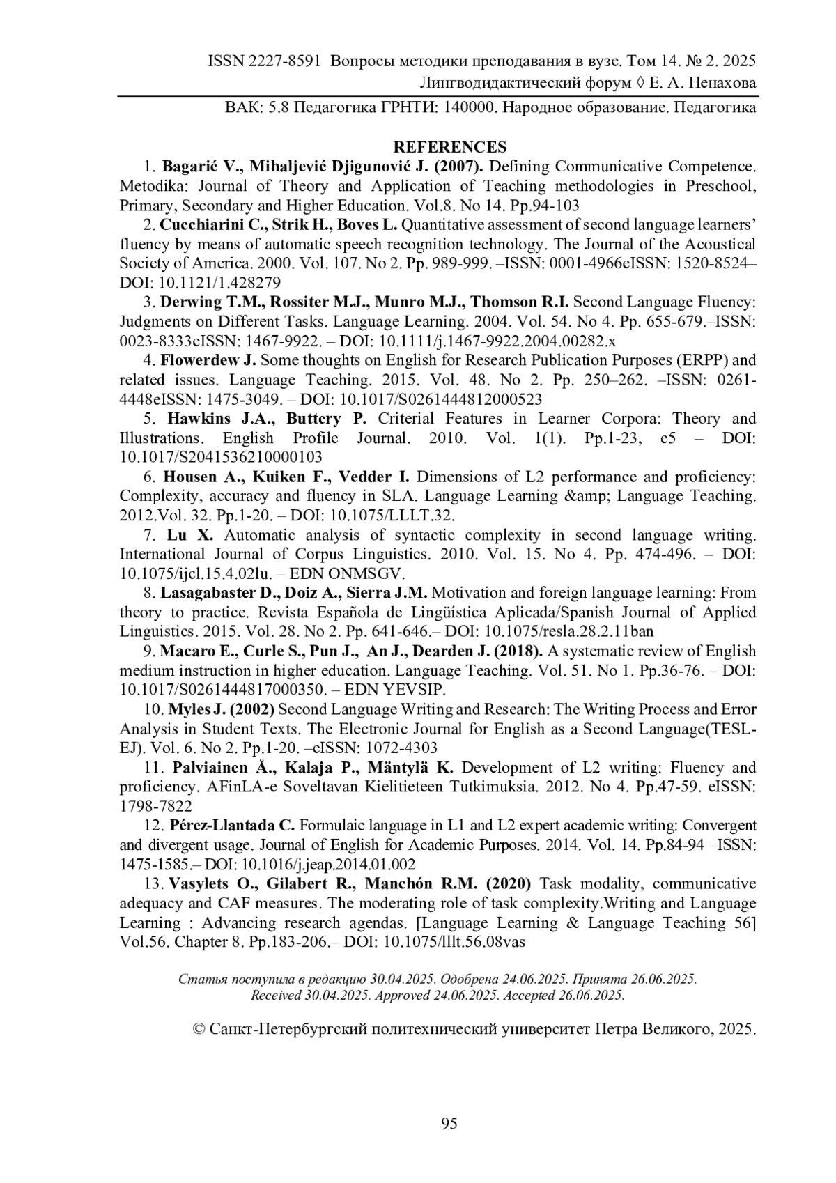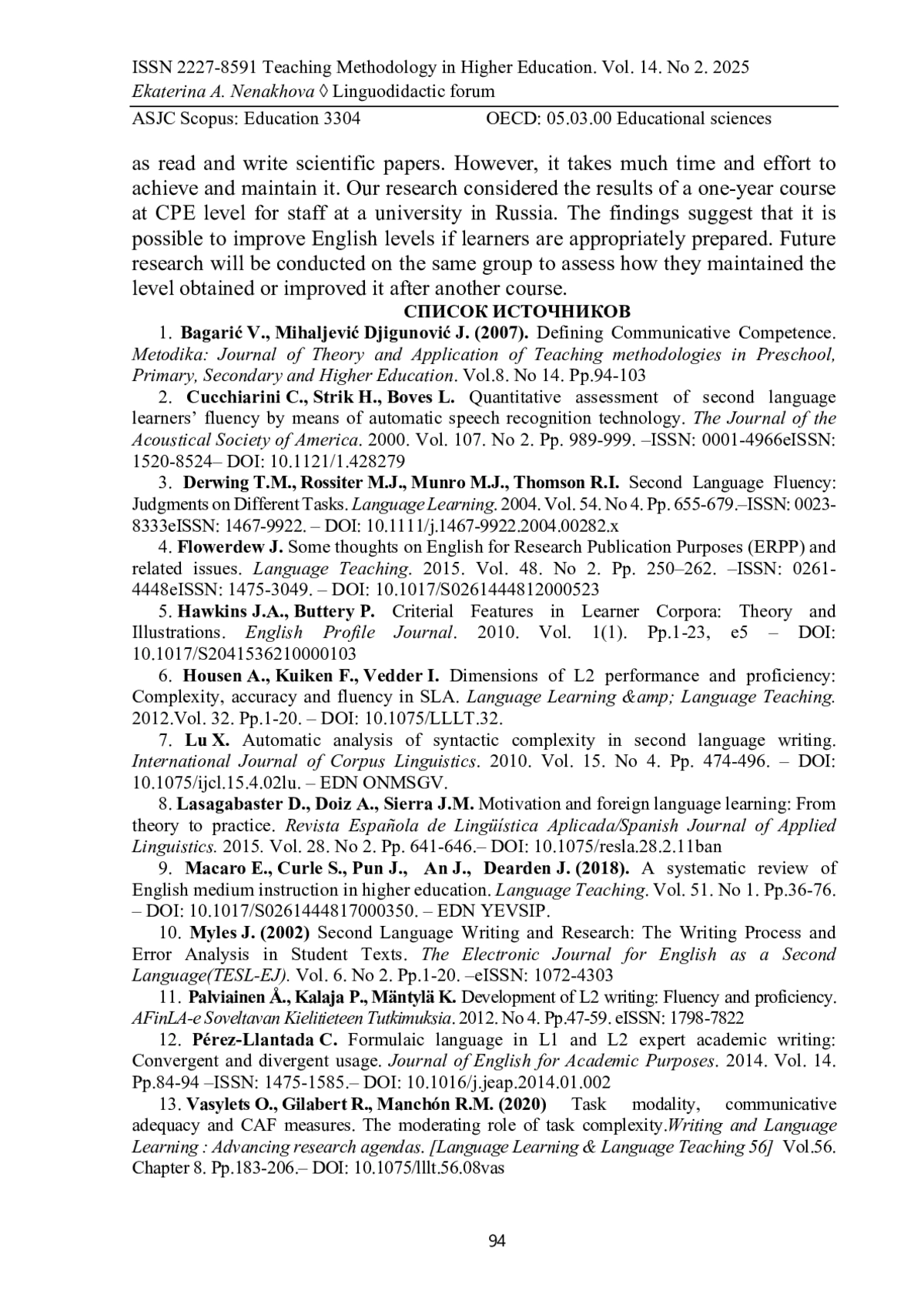 11. Palviainen Å., Kalaja P., Mäntylä K. Development of L2 writing: Fluency and proficiency. AFinLA-e Soveltavan Kielitieteen Tutkimuksia. 2012. No 4. Pp.47-59. eISSN: 1798-7822.