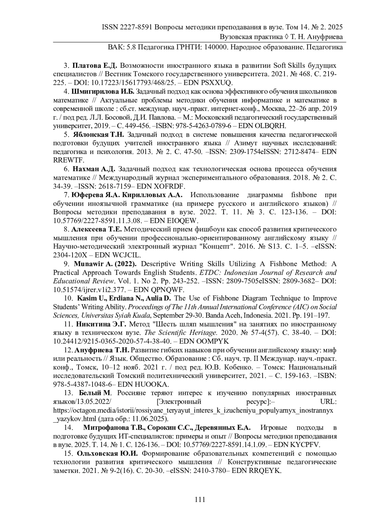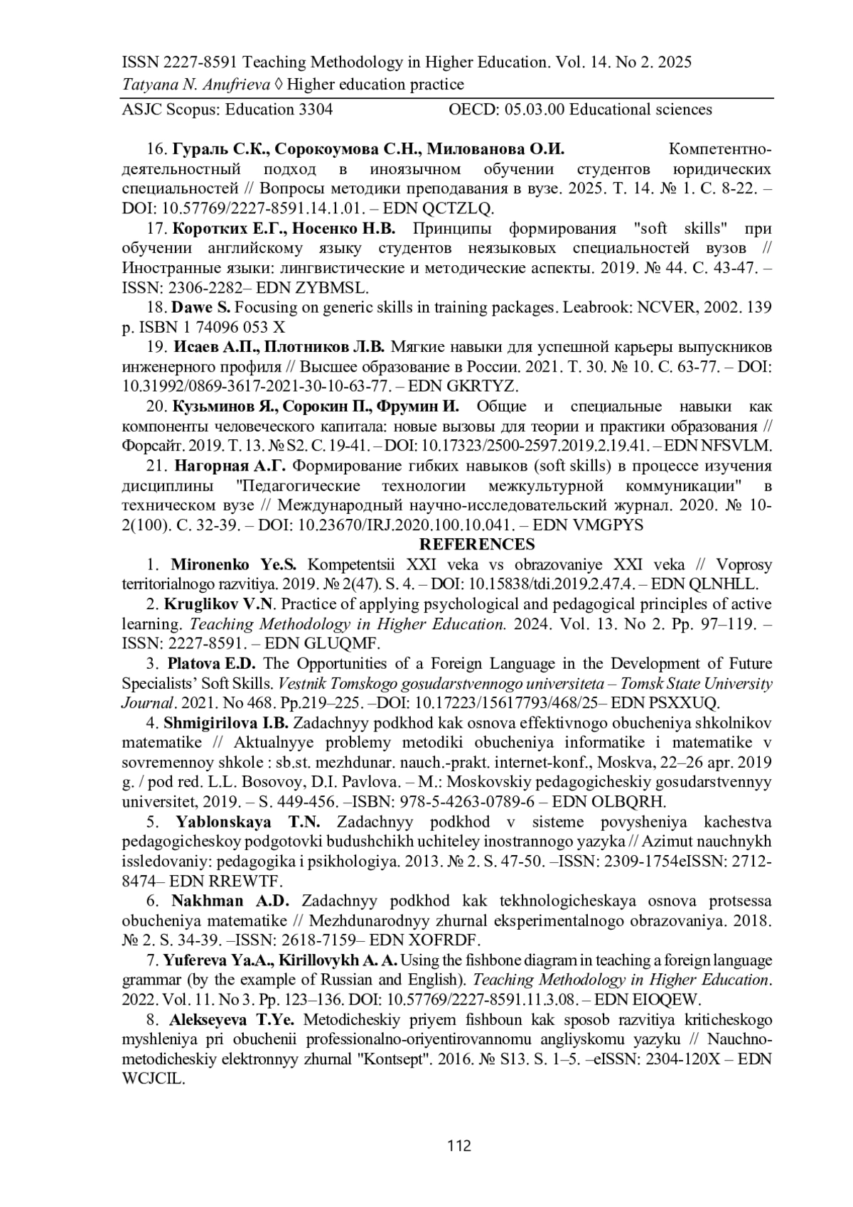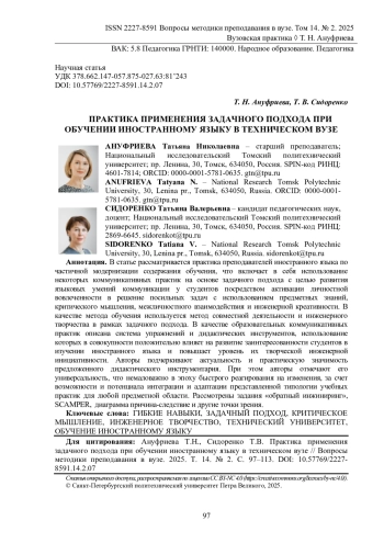 12. Ануфриева Т.Н. Развитие гибких навыков при обучении английскому языку: миф или реальность // Язык. Общество. Образование: Сб. науч. тр. II Междунар. науч.-практ. конф., Томск, 10-12 нояб. 2021 г. / под ред. Ю.В. Кобенко. - Томск: Национальный исследовательский Томский политехнический университет, 2021. - С. 159-163. -. ISBN: 978-5-4387-1048-6 EDN: HUOOKA