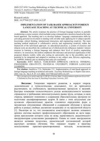 Студенты младших курсов технических вузов испытывают трудности c высказыванием на занятиях по иностранному языку по разным причинам. Переход на онлайн-обучение, вызванный пандемией COVID-19, усугубил эту тенденцию. Сегодня одной из важных задач является поиск нестандартных решений, мотивирующих неактивных студентов, предпочитающих молчать, говорить на аудиторных занятиях по иностранному языку. Одним из таких решений может стать использование комиксов в образовательном процессе при условии наличия интереса к ним со стороны студентов и осознание преподавателями их дидактического потенциала. В рамках предварительного этапа исследования в Санкт-Петербургском политехническом университете Петра Великого было проведено анкетирование, которое, с одной стороны, выявило интерес студентов младших курсов к комиксам, а с другой, показало отсутствие опыта их использования в качестве образовательного ресурса у преподавателей английского языка как иностранного. После создания и апробирования открытого онлайн-курса на платформе Stepik по мотивам популярных комиксов Ava’s Demon и Ghost Blade, направленного на развитие продуктивных устных речевых навыков, была проведена оценка его эффективности в рамках интенсивной самостоятельной работы студентов из «группы риска на отчисление» по причине их неуспеваемости в курсе иностранного языка в весеннем семестре 2020/2021 учебного года. Анализ результатов обучения по онлайн-курсу и мониторинга работы студентов, а также опроса студентов после завершения курса и наблюдения за работой студентов на аудиторном занятии после окончания курса, подтвердили его эффективность в развитии речевых навыков разговорно-неактивных студентов. Намечены дальнейшие этапы исследования.