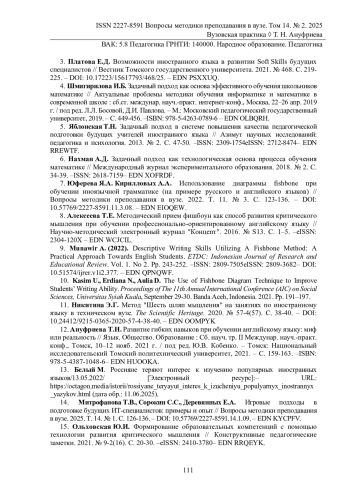 8. Алексеева Т.Е. Методический прием фишбоун как способ развития критического мышления при обучении профессионально-ориентированному английскому языку // Научно-методический электронный журнал “Концепт”. 2016. № S13. С. 1-5. -eISSN: 2304-120X. EDN: WCJCIL