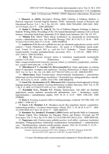 21. Нагорная А.Г. Формирование гибких навыков (soft skills) в процессе изучения дисциплины “Педагогические технологии межкультурной коммуникации” в техническом вузе // Международный научно-исследовательский журнал. 2020. № 10-2(100). С. 32-39. -. DOI: 10.23670/IRJ.2020.100.10.041 EDN: VMGPYS
