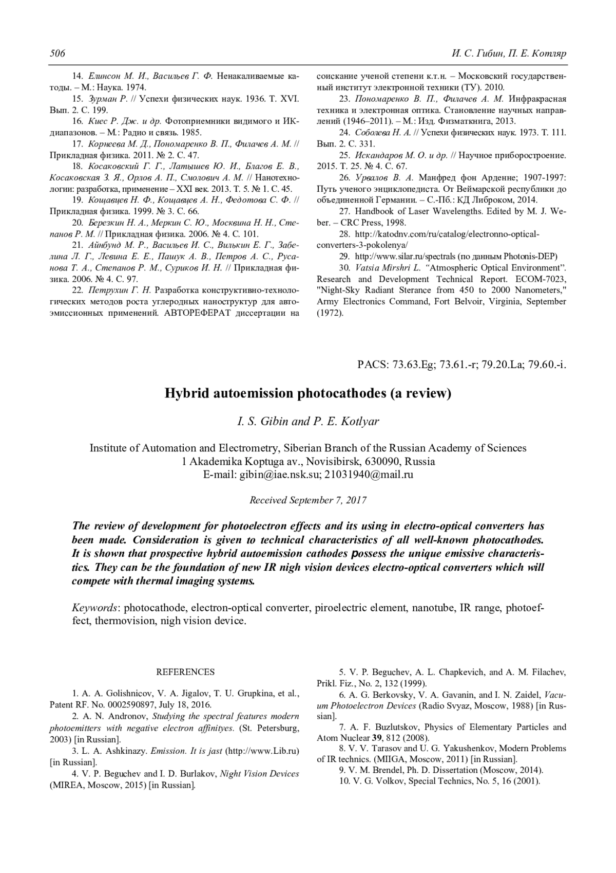 Гибин И. С., Котляр П. Е. Гибридные автоэмиссионные фотокатоды (обзор) 497