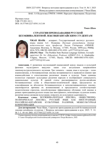 12. Ли Цзяци Особенности работы с безэквивалентной лексикой на занятиях по русскому языку как иностранному в китайской аудитории // Наука и школа. 2019. № 5. С. 131-135. -ISSN: 1819-463X. EDN: BBPVFO