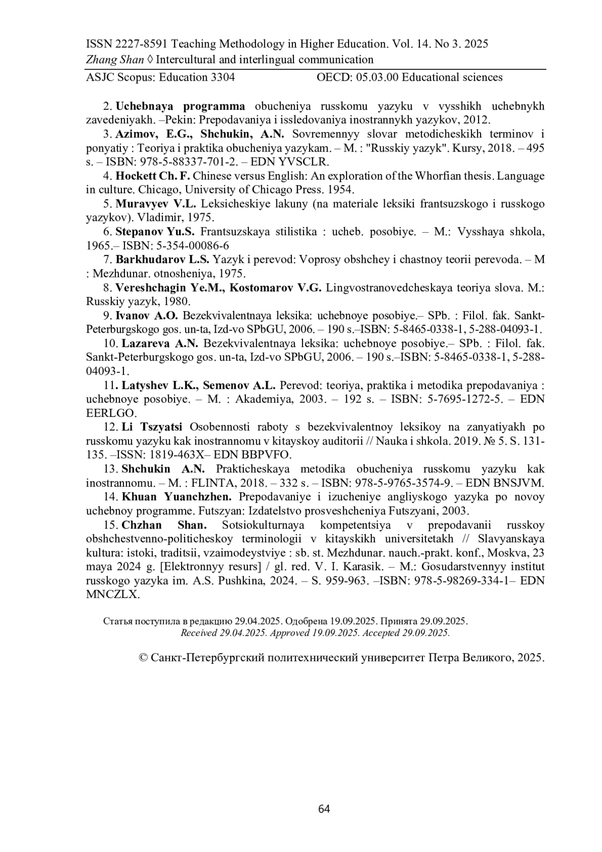 15. Чжан Шань. Социокультурная компетенция в преподавании русской общественно-политической терминологии в китайских университетах // Славянская культура: истоки, традиции, взаимодействие: сб. ст. Междунар. науч.-практ. конф., Москва, 23 мая 2024 г. [Электронный ресурс] / гл. ред. В. И. Карасик. - М.: Государственный институт русского языка им. А.С. Пушкина, 2024. - С. 959-963. -. ISBN: 978-5-98269-334-1 EDN: MNCZLX