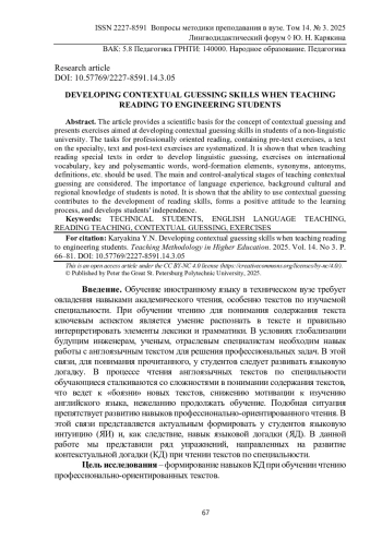 Введение. Обучение иностранному языку в техническом вузе требует овладения навыками академического чтения, особенно текстов по изучаемой специальности. При обучении чтению для понимания содержания текста ключевым аспектом является умение распознать в тексте и правильно интерпретировать элементы лексики и грамматики. В условиях глобализации будущим инженерам, ученым, отраслевым специалистам необходим навык работы с англоязычным текстом для решения профессиональных задач. В этой связи, для понимания прочитанного, у студентов следует развивать языковую догадку. В процессе чтения англоязычных текстов по специальности обучающиеся сталкиваются со сложностями в понимании содержания текстов, что ведет к «боязни» новых текстов, снижению мотивации к изучению английского языка, нежеланию продолжать обучение. Подобная ситуация препятствует развитию навыков профессионально-ориентированного чтения. В этой связи представляется актуальным формировать у студентов языковую интуицию (ЯИ) и, как следствие, навык языковой догадки (ЯД). В данной работе мы представили ряд упражнений, направленных на развитие контекстуальной догадки (КД) при чтении текстов по специальности