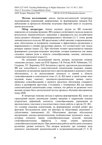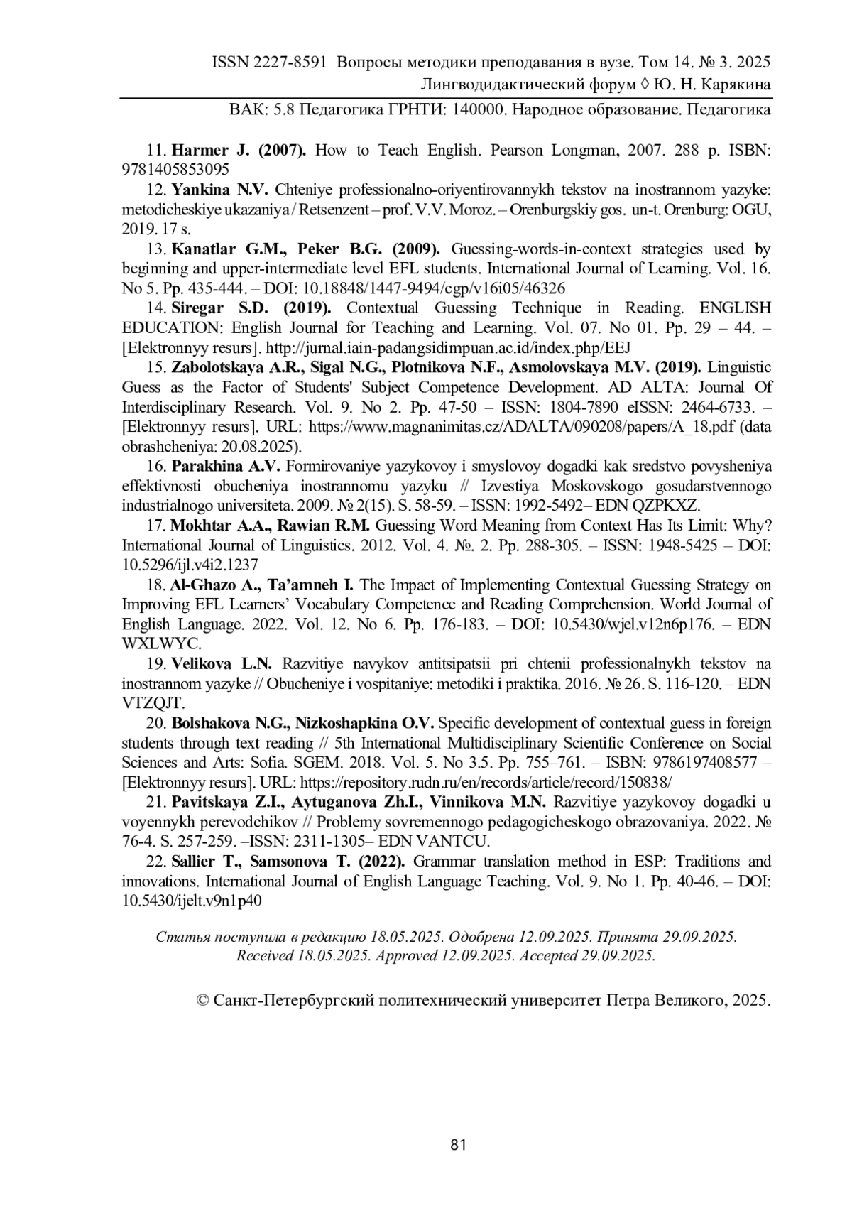 15. Zabolotskaya A.R., Sigal N.G., Plotnikova N.F., Asmolovskaya M.V. (2019) Linguistic Guess as the Factor of Students’ Subject Competence Development. AD ALTA: Journal Of Interdisciplinary Research. Vol. 9. No 2. Pp. 47-50 - ISSN: 1804-7890 eISSN: 2464-6733. - [Электронный ресурс]. URL: https://www.magnanimitas.cz/ADALTA/090208/papers/A_18.pdf (дата обращения: 20.08.2025).