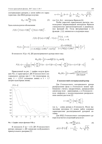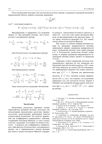 Полученные результаты упрощают оценку характеристик рупорной антенны, поскольку для использования предлагаемых расчетных формул достаточно существующих инженерных пакетов компьютерной математики. Что касается выражений для коэффициента направленного действия, содержащих интегралы Френеля, то здесь следует отметить следующее. В пособии [3] имеются опечатки – в формуле для коэффициента направленного действия как H-плоскостного секториального рупора, так и пирамидального рупора функция g() вместо суммы интегралов Френеля содержит их разность. Аналогичная неточность имеется и в книге [2] – хотя там стоит сумма интегралов Френеля, но фигурирующий в них аргумент равен – , что ввиду нечетности функций C(x), S(x) эквивалентно разности интегралов Френеля.