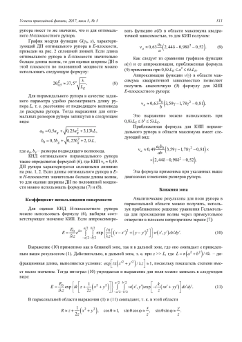 Сравнение точного выражения для поля электромагнитного импульса на оси однородно возбужденной круглой антенны радиуса r0 [8] с оценкой поля импульса на основе (10) [9] показывает, что приближенное решение (10) можно использовать при 2 r0 /z2 << 1. Полагая для практических расчетов 2 2 r0 / z 0,1, получим условие применимости (10): z 3,2r0. Это означает, что полученное выражение (12) для плотности потока энергии в ближней зоне рупорной антенны можно использовать при z zc, где zc = 1,6 a2 b2, a, b – размеры рупора.