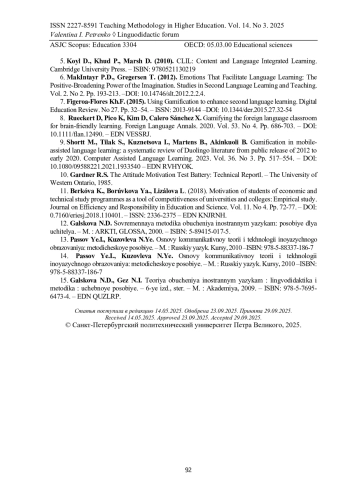 8. Rueckert D, Pico K, Kim D, Calero Sánchez X. Gamifying the foreign language classroom for brain-friendly learning. Foreign Language Annals. 2020. Vol. 53. No 4. Pp. 686-703. -. DOI: 10.1111/flan.12490 EDN: VESSRJ