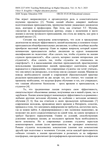 7. Кругликов В.Н. Лекция в эпоху информационного общества и ее перспективы в будущем // Научно-технические ведомости Санкт-Петербургского государственного политехнического университета. Гуманитарные и общественные науки. 2017. Т. 8. № 1. С. 142-151. EDN: YRXLYZ