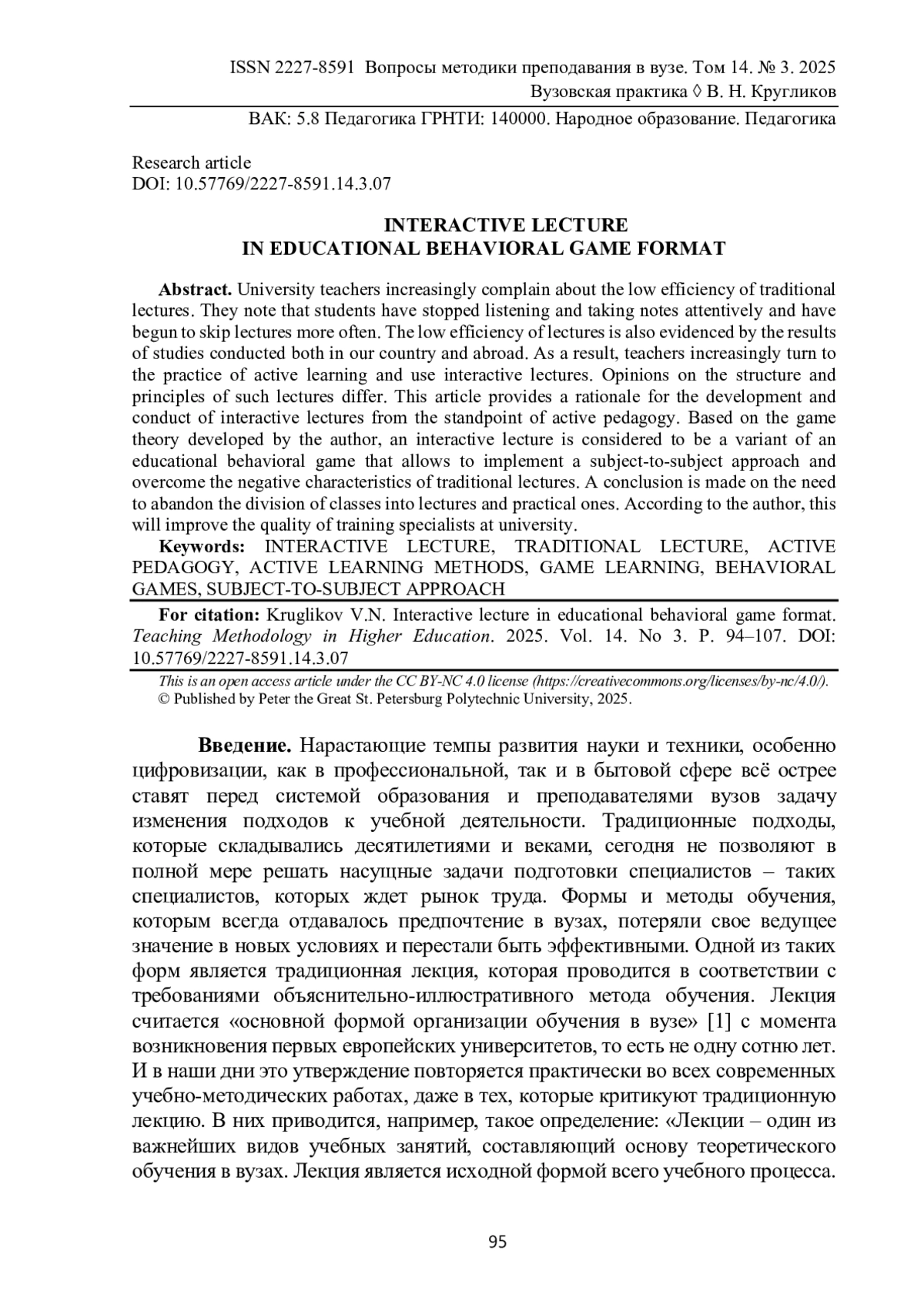 Преподаватели вузов все чаще жалуются на низкую эффективность традиционных лекций. Отмечают, что студенты перестали внимательно слушать и конспектировать, стали чаще пропускать лекции. О низкой эффективности лекций свидетельствуют и результаты исследований, проведенных как в нашей стране, так и за рубежом. Вследствие этого, все чаще преподаватели обращаются к практике активного обучения и используют интерактивные лекции. Мнения о структуре и принципах проведения таких лекций расходятся. В данной статье приводится обоснование разработки и проведения интерактивных лекций с позиций активной педагогики. На основе разработанной автором теории игры, интерактивная лекция рассматривается как вариант обучающей поведенческой игры, позволяющей реализовать субъектсубъектный подход и преодолеть негативные явления, характерные для традиционных лекций. В заключение делается вывод о необходимости отказа от деления занятий на лекционные и практические. Это, по мнению автора, позволит повысить качество вузовской подготовки специалистов