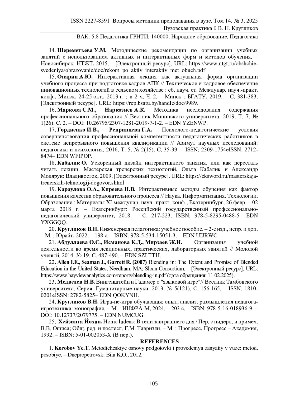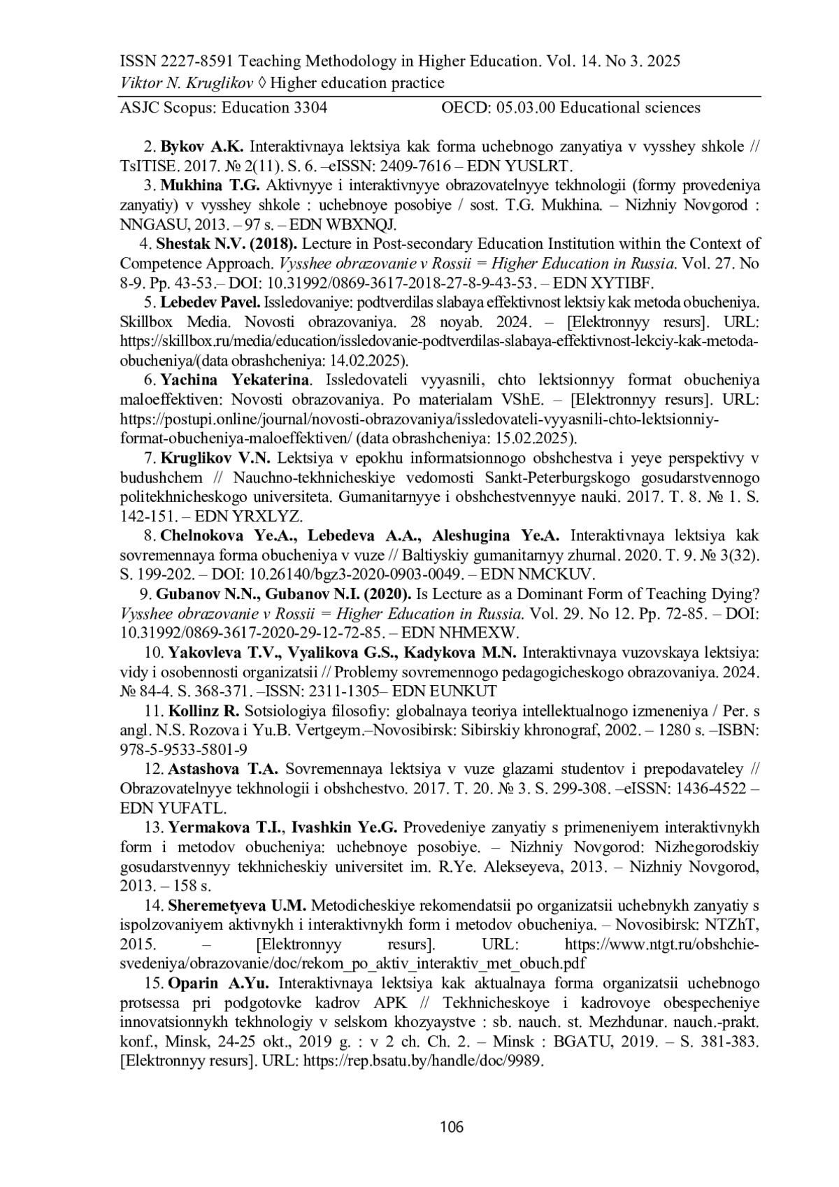 9. Губанов Н.Н., Губанов Н.И. Отмирает ли лекция в качестве ведущей формы обучения? // Высшее образование в России. 2020. Т. 29. № 12. С. 72-85. -. DOI: 10.31992/0869-3617-2020-29-12-72-85 EDN: NHMEXW