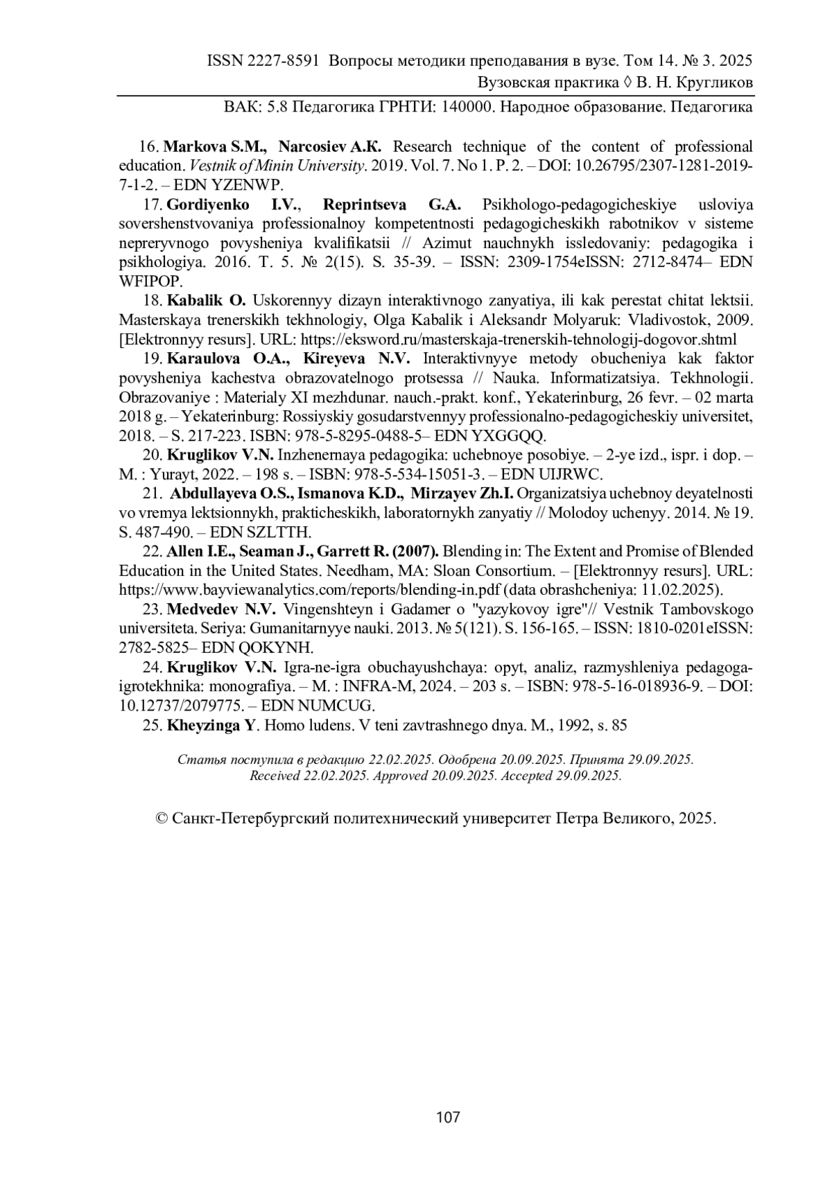 10. Яковлева Т.В., Вяликова Г.С., Кадыкова М.Н. Интерактивная вузовская лекция: виды и особенности организации // Проблемы современного педагогического образования. 2024. № 84-4. С. 368-371. -ISSN: 2311-1305. EDN: EUNKUT