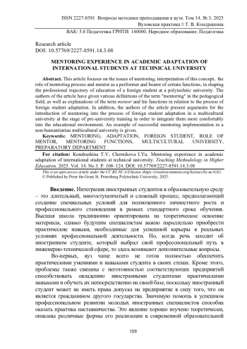 Данная статья посвящена вопросам наставничества, трактовкам этого понятия и роли процесса наставничества и наставника, как исполнителя и носителя определённых функций, при формировании профессиональной траектории образования иностранного обучающегося в политехническом вузе. Авторами статьи даны различные определения термина «наставничество» применительно в педагогической сфере, а также даны пояснения по термину наставник и представлены его функции относительно процесса адаптации иностранных обучающихся. Помимо этого, авторы статьи приводят доводы, которые являются аргументами для внедрения наставничества в процесс адаптации иностранных обучающихся в поликультурном вузе уже на этапе довузовской подготовки с целью их более комфортного интегрирования в образовательную среду. Приведён пример успешной практики внедрения наставничества в негуманитарном поликультурном вузе.
