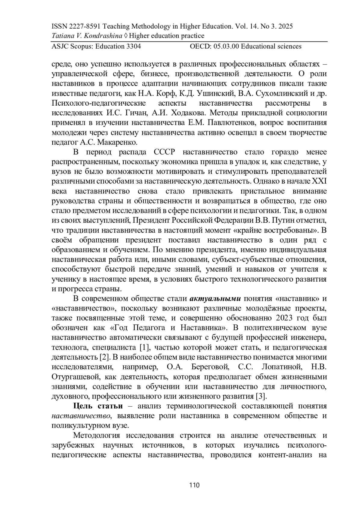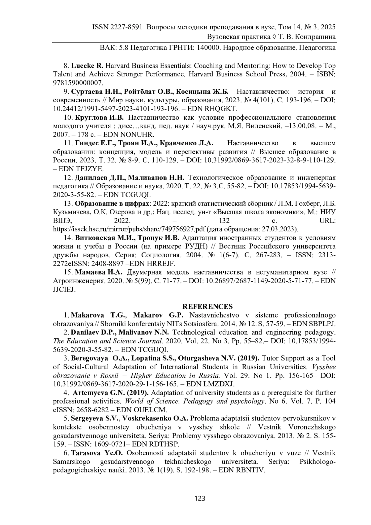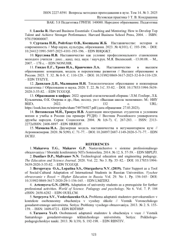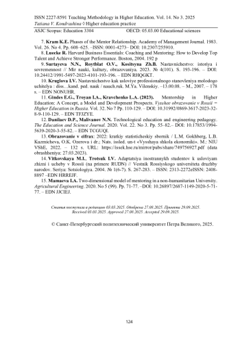 11. Гиндес Е.Г., Троян И.А., Кравченко Л.А. Наставничество в высшем образовании: концепция, модель и перспективы развития // Высшее образование в России. 2023. Т. 32. № 8-9. С. 110-129. -. DOI: 10.31992/0869-3617-2023-32-8-9-110-129 EDN: TFJZYE