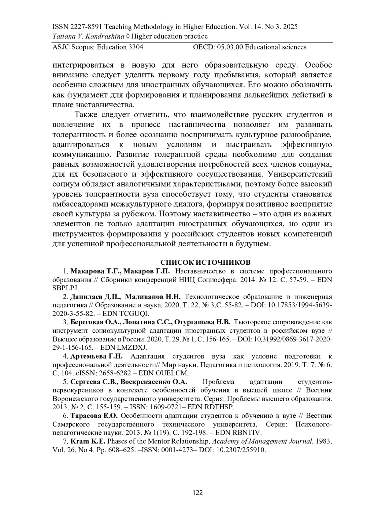 3. Береговая О.А., Лопатина С.С., Отургашева Н.В. Тьюторское сопровождение как инструмент социокультурной адаптации иностранных студентов в российском вузе // Высшее образование в России. 2020. Т. 29. № 1. С. 156-165. -. DOI: 10.31992/0869-3617-2020-29-1-156-165 EDN: LMZDXJ