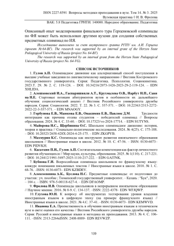 1. Гулов А.П. Олимпиадное движение как альтернативный способ поступления в высшие учебные заведения по лингвистическому направлению // Вестник Костромского государственного университета. Серия: Педагогика. Психология. Социокинетика. 2023.Т. 29. № 2. С. 119-124. -. DOI: 10.34216/2073-1426-2023-29-2-119-124 EDN: XHLIDA