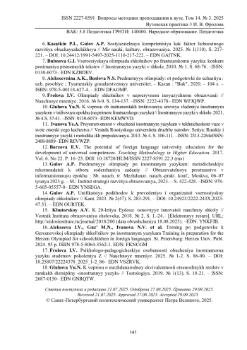 13. Гулов А.П. Предметные олимпиады по иностранным языкам: методические рекомендации к отбору содержания заданий // Образовательное пространство в информационную эпоху: Сб. науч. тр. Междунар. науч.-практ. конф., Москва, 06-07 июня 2023 г. - М.: Институт стратегии развития образования, 2023. - С. 422-428. -. ISBN: 978-5-605-05557-0 EDN: YNSEGA