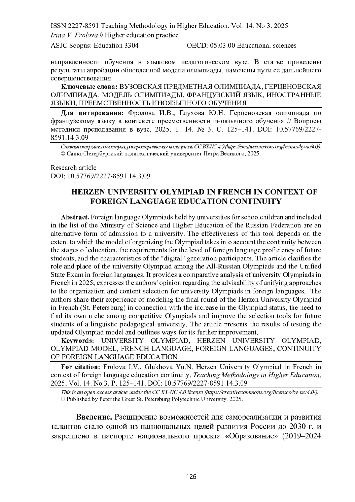 Предметные олимпиады по иностранным языкам, проводимые российскими вузами для учащихся средней школы и входящие в перечень, утверждаемый Министерством науки и высшего образования РФ, выступают альтернативной формой поступления в высшие учебные заведения. По мнению авторов статьи, эффективность использования данного инструмента во многом зависит от того, насколько в модели организации олимпиады учтено множество факторов (преемственность между ступенями среднего и высшего образования, требования к уровню иноязычной подготовленности будущих студентов, особенности участников т. н. «цифрового» поколения). Предметные олимпиады по иностранным языкам рассматриваются с позиций инструмента для формирования и отбора субъектов вузовского обучения и воспитания, а также преемственности в иноязычном обучении. В статье уточняются роль и место вузовской предметной олимпиады, Всероссийской предметной олимпиады и профильного ЕГЭ по иностранным языкам в системе иноязычного обучения; приводится сравнительный анализ «перечневых» олимпиад по французскому языку 2025 г.; высказывается мнение авторов относительно целесообразности унифицировать подходы к организации и отбору содержания вузовских олимпиад по иностранным языкам. Авторы делятся своим опытом моделирования заключительного тура Герценовской олимпиады по французскому языку (РГПУ им. А. И. Герцена, Санкт-Петербург) в связи с повышением статуса олимпиады в 2025 г. (I уровень РСОШ), необходимостью поиска собственной ниши среди конкурентных олимпиад, адаптации к новому поколению участников при соблюдении принципов преемственности в иноязычном обучении и с учетом профильной направленности обучения в языковом педагогическом вузе. В статье приведены результаты апробации обновленной модели олимпиады, намечены пути ее дальнейшего совершенствования