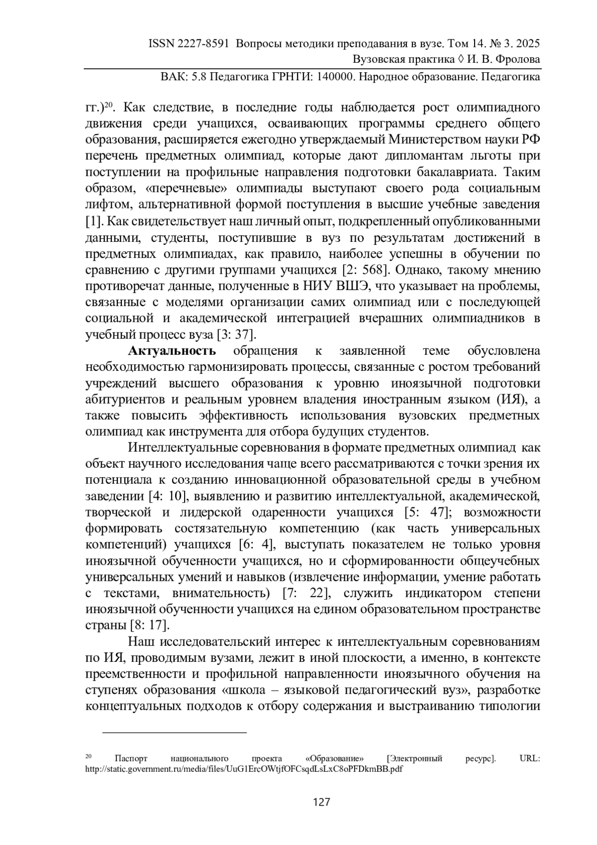 9. Фролова И.В. Олимпиады школьников в непрерывном иноязычном образовании // Научное мнение. 2016. № 8-9. С. 134-137. -ISSN: 2222-4378. EDN: WFJQWP