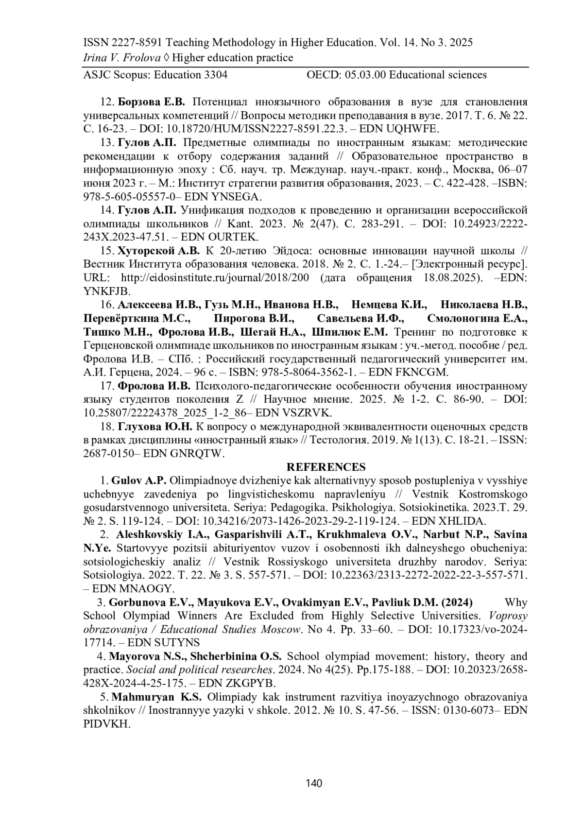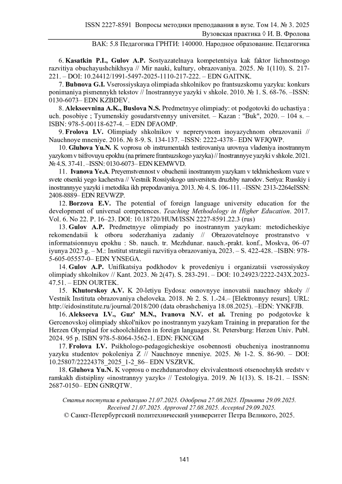 17. Фролова И.В. Психолого-педагогические особенности обучения иностранному языку студентов поколения Z // Научное мнение. 2025. № 1-2. С. 86-90. -. DOI: 10.25807/22224378_2025_1-2_86 EDN: VSZRVK