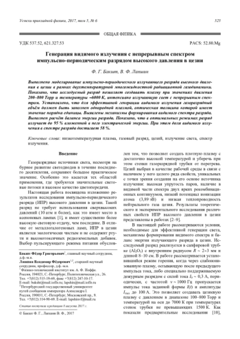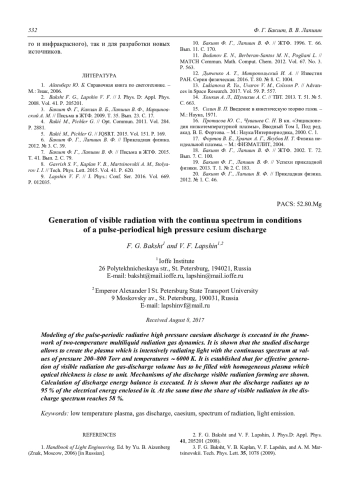 Бакшт Ф. Г., Лапшин В. Ф. Генерация видимого излучения с непрерывным спектром импульсно-периодическим разрядом высокого давления в цезии 525