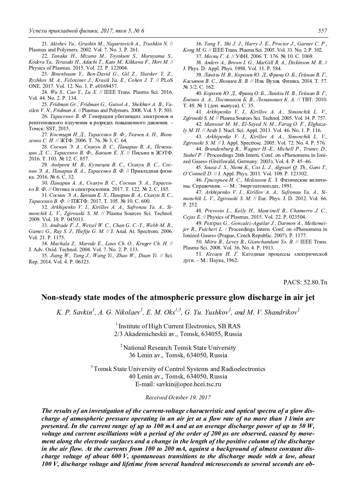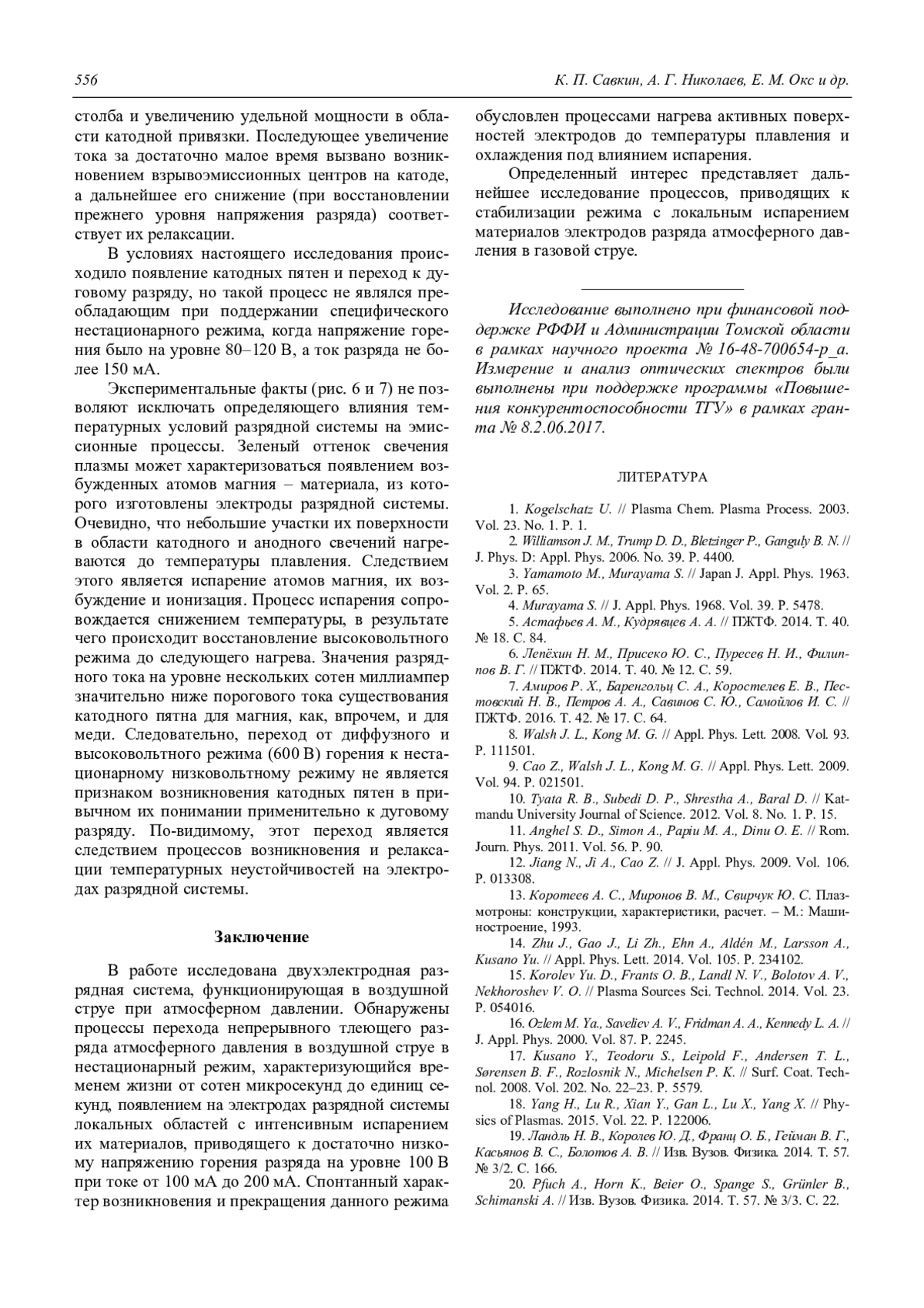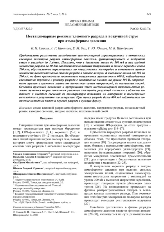 Савкин К. П., Николаев А. Г., Окс Е. М., Юшков Г. Ю., Шандриков М. В. Нестационарные режимы тлеющего разряда в воздушной струе при атмосферном давлении 549