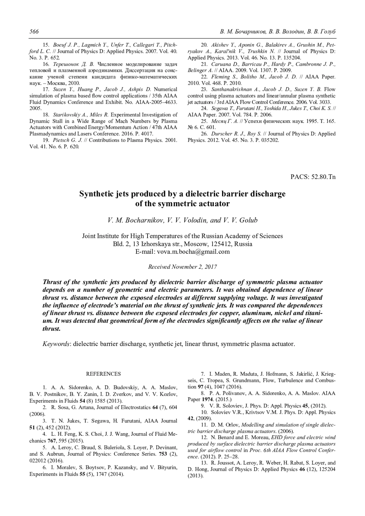 23. Santhanakrishnan A., Jacob J. D., Suzen Y. B. Flow control using plasma actuators and linear/annular plasma synthetic jet actuators / 3rd AIAA Flow Control Conference. 2006. Vol. 3033.
