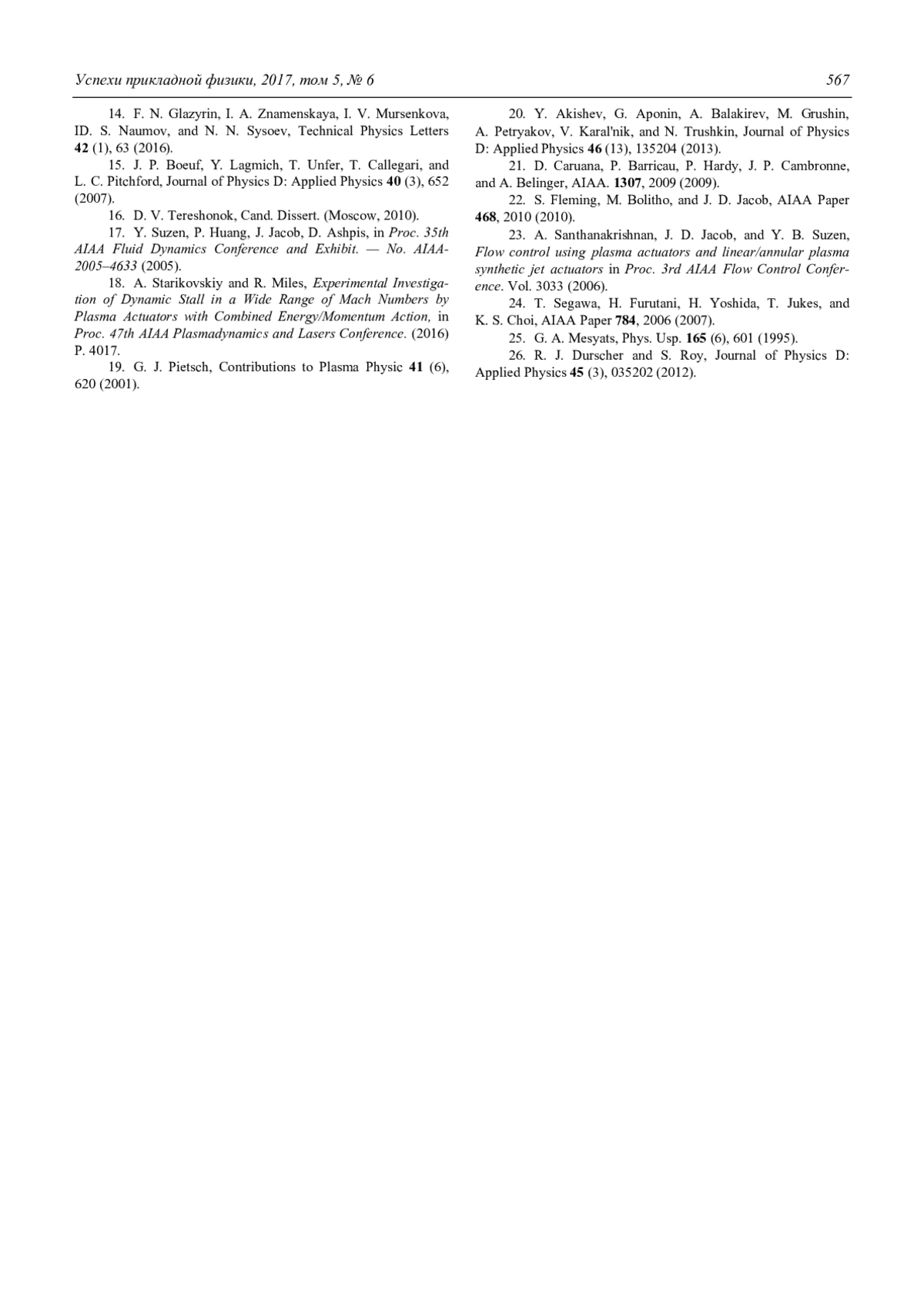 14. Glazyrin F. N., Znamenskaya I. A., Mursenkova I. V., Naumov D. S., Sysoev N. N. // Technical Physics Letters. 2016. Vol. 42. No. 1. P. 63. EDN: WWALHR