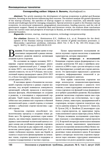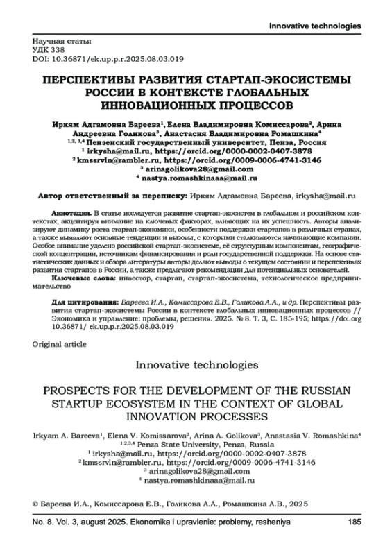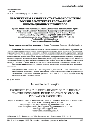 В статье исследуется развитие стартап-экосистем в глобальном и российском контекстах, акцентируя внимание на ключевых факторах, влияющих на их успешность. Авторы анализируют динамику роста стартап-экономики, особенности поддержки стартапов в различных странах, а также выявляют основные тенденции и вызовы, с которыми сталкиваются начинающие компании. Особое внимание уделено российской стартап-экосистеме, её структурным компонентам, географической концентрации, источникам финансирования и роли государственной поддержки. На основе статистических данных и обзора литературы авторы делают выводы о текущем состоянии и перспективах развития стартапов в России, а также предлагают рекомендации для потенциальных основателей.