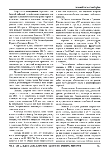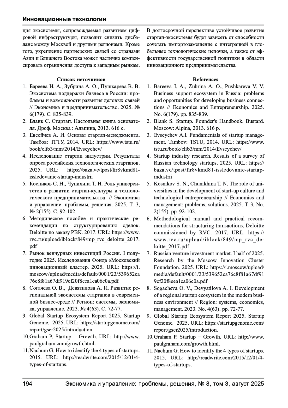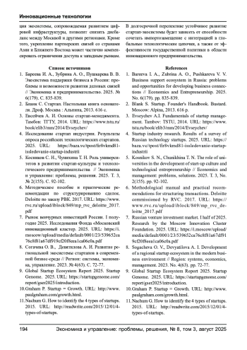 5. Косников С. Н., Чунихина Т. Н. Роль университетов в развитии стартап-культуры и технологического предпринимательства // Экономика и управление: проблемы, решения. 2025. Т. 3, № 2(155). С. 92-102. EDN: COHFNF