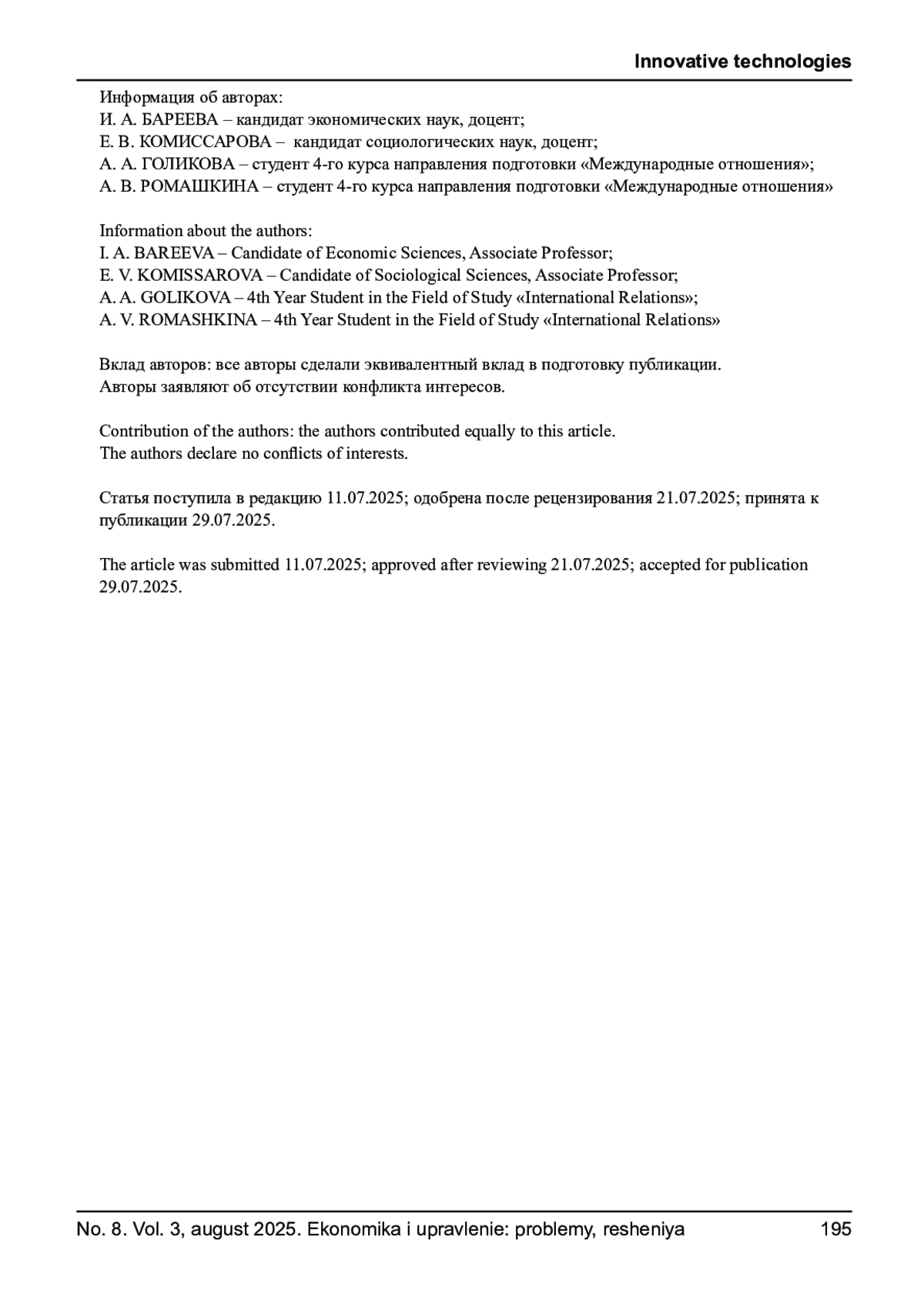 1. Бареева И. А., Зубрина А. О., Пушкарева В. В. Экосистема поддержки бизнеса в России: проблемы и возможности развития деловых связей // Экономика и предпринимательство. 2025. № 6(179). С. 835-839. EDN: FONRIP
