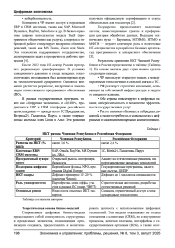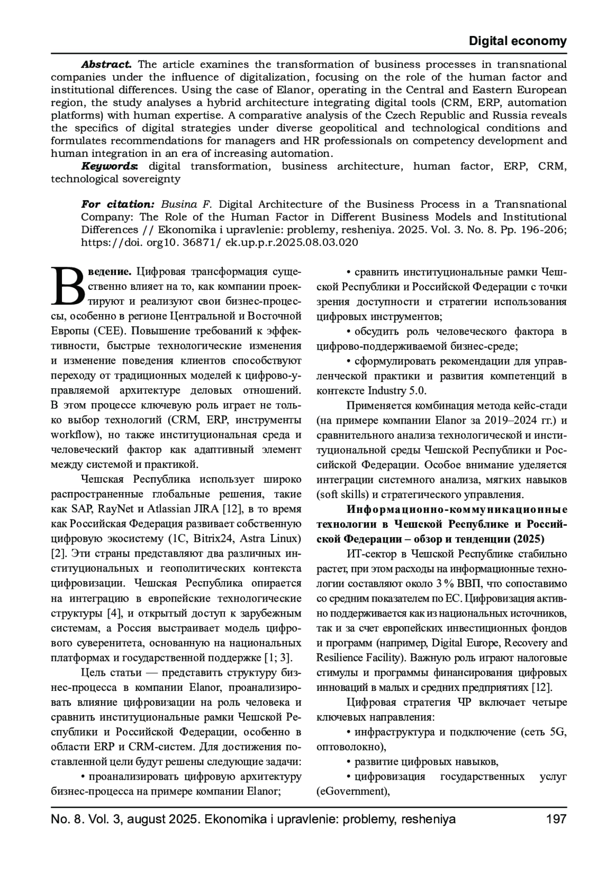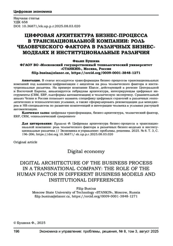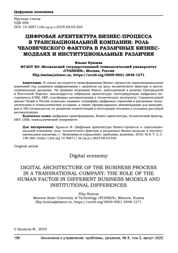 В статье исследуется трансформация бизнес-процессов транснациональных компаний под влиянием цифровизации с акцентом на роль человеческого фактора и институциональные различия. На примере компании Elanor, действующей в регионе Центральной и Восточной Европы, анализируется гибридная архитектура, интегрирующая цифровые инструменты (CRM, ERP, платформы автоматизации) и человеческую экспертизу. Сравнительный анализ Чехии и России позволяет выявить специфику цифровых стратегий в различных геополитических и технологических условиях, а также сформулировать рекомендации для менеджеров и HR-специалистов по развитию компетенций и интеграции человека в условиях растущей автоматизации.