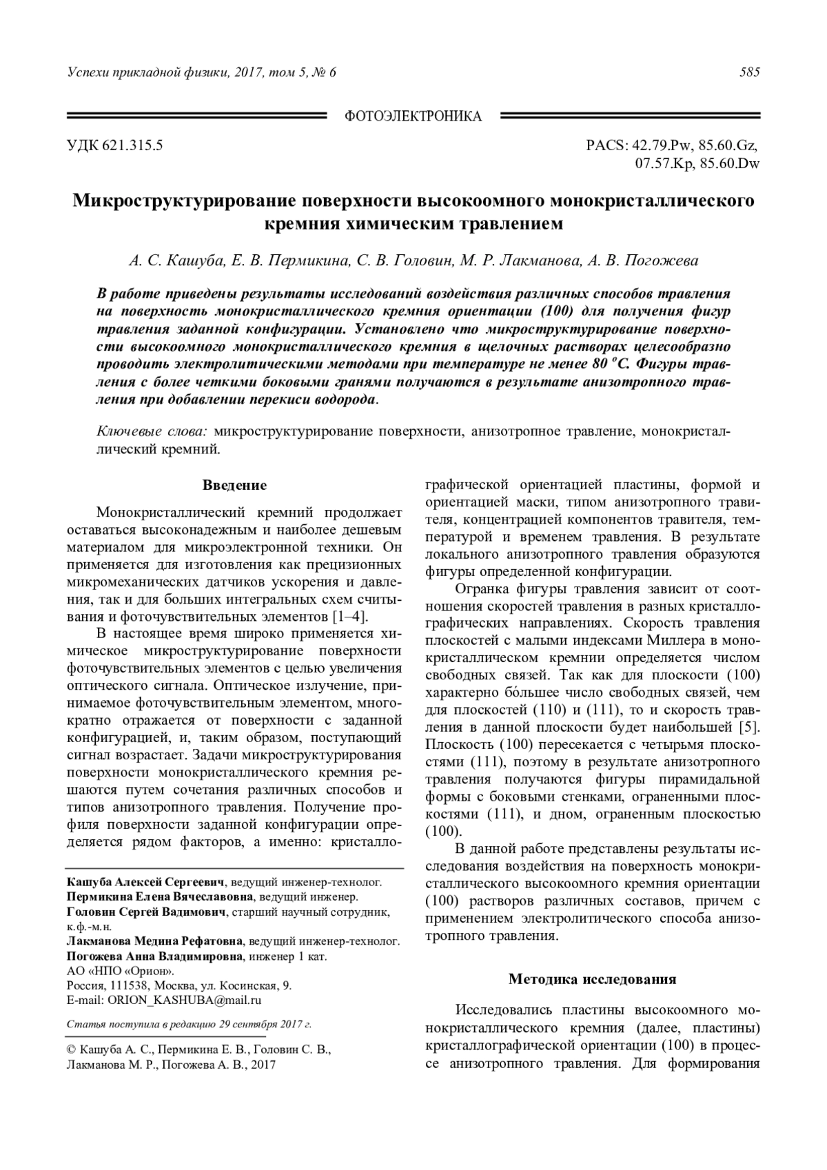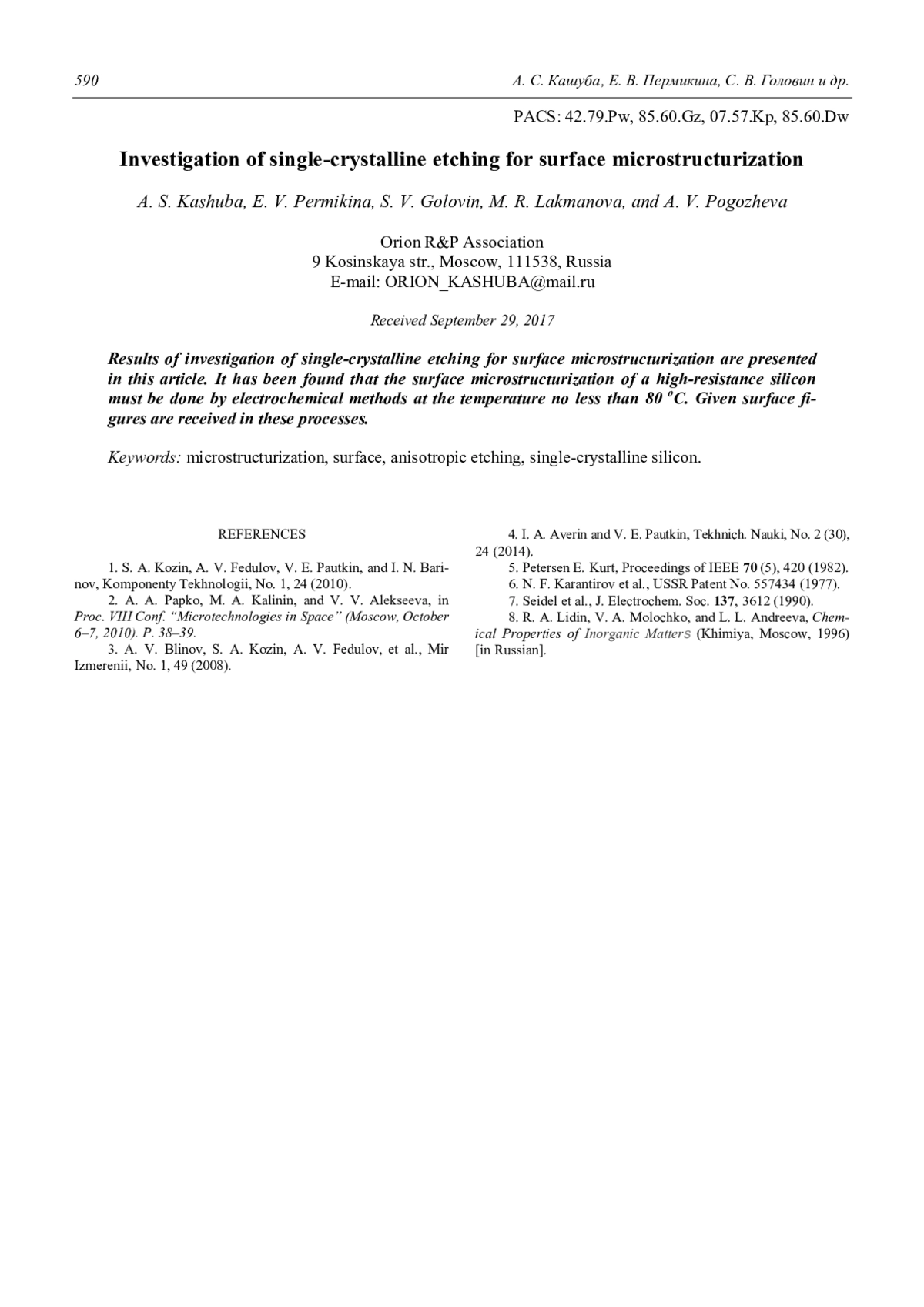 A. S. Kashuba, E. V. Permikina, S. V. Golovin, M. R. Lakmanova, and A. V. Pogozheva Investigation of single-crystalline etching for surface microstructurization 585