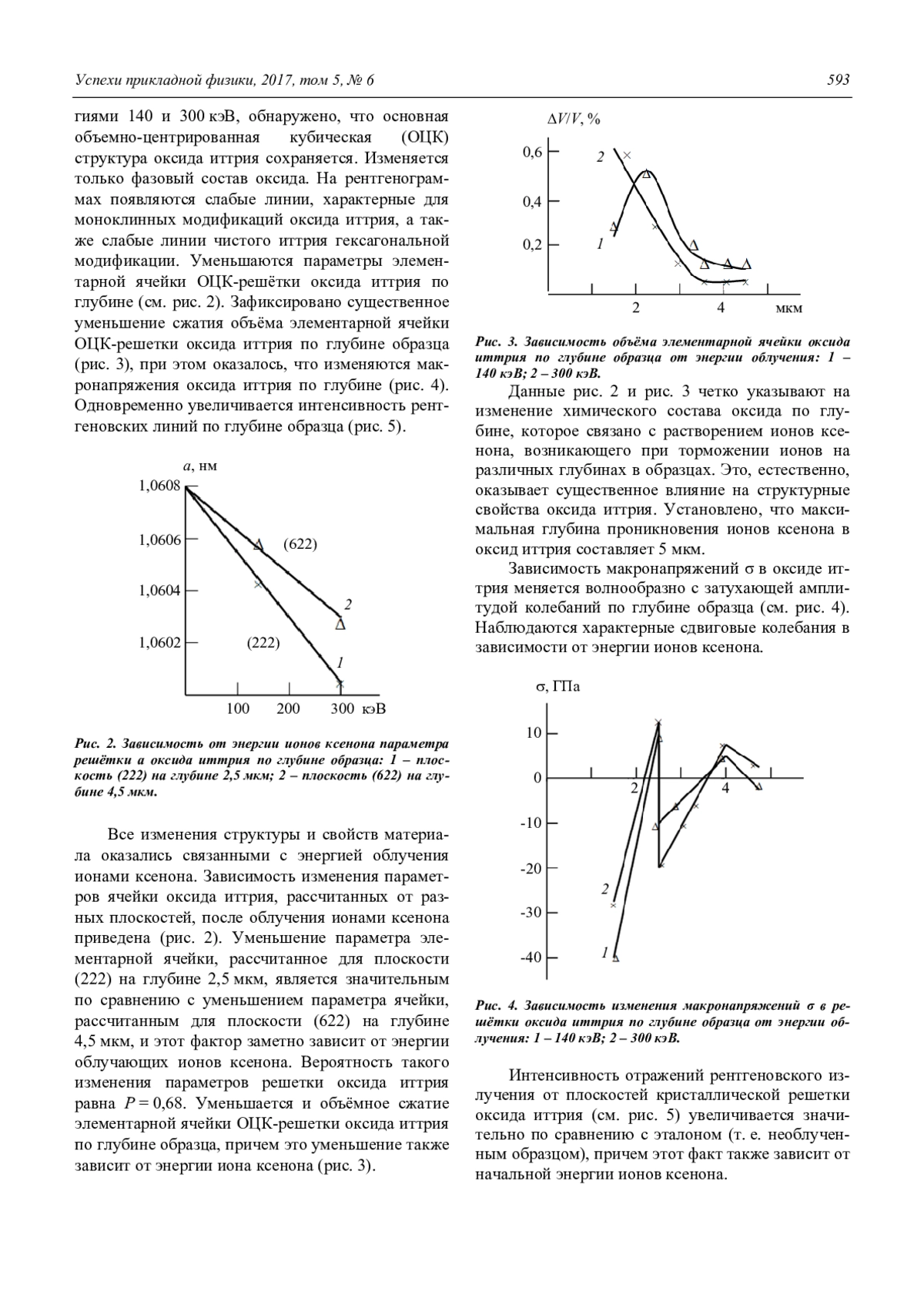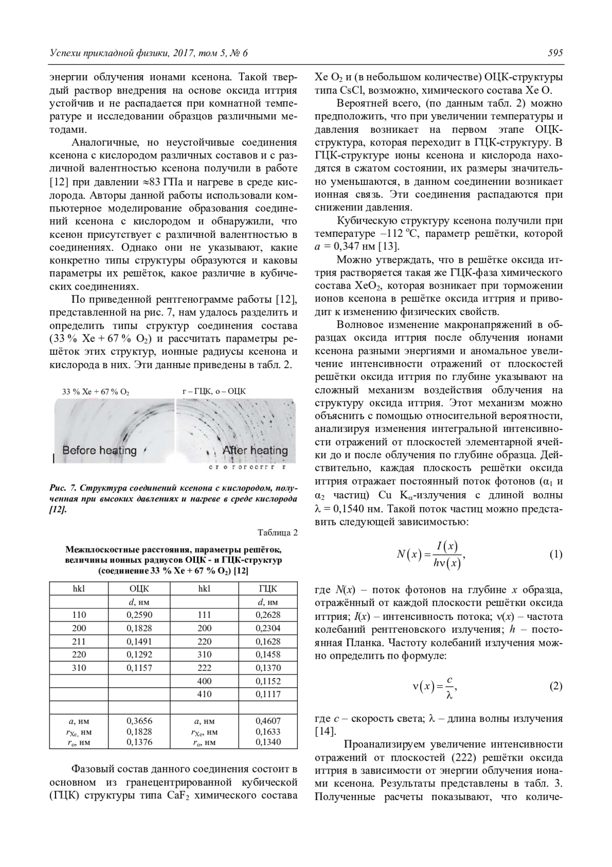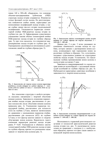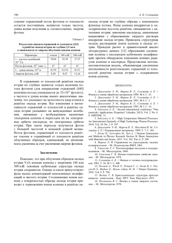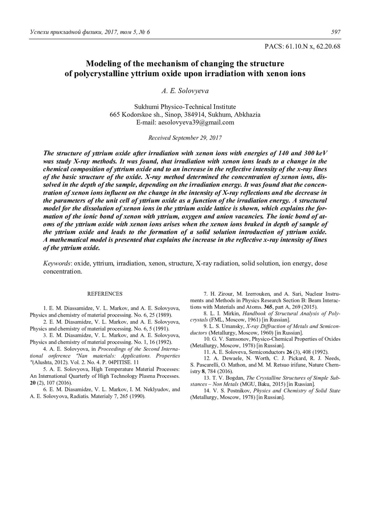 Проведено рентгеновское исследование структуры оксида иттрия после облучения ионами ксенона с энергиями 140 и 300 кэВ. Обнаружено, что облучение ионами ксенона приводит к изменению химического состава оксида иттрия и увеличению отражательной интенсивности рентгеновских линий основной структуры оксида. Рентгеновским методом определена концентрация ионов ксенона, растворенная по глубине образца, в зависимости от энергии облучения. Обнаружено, что концентрация ионов ксенона влияет на изменение интенсивности рентгеновских отражений и уменьшение параметров элементарной ячейки оксида иттрия в зависимости от энергии облучения. Показана структурная модель растворения ионов ксенона в решетке оксида иттрия, которая объясняет образование ионной связи ксенона с атомами иттрия, кислорода и анионными вакансиями. Ионная связь атомов оксида иттрия с ионами ксенона возникает при торможении их по глубине образца оксида иттрия и приводит к образованию твердого раствора внедрения на основе оксида иттрия. Приведена математическая модель, которая объясняет увеличение отражательной рентгеновской интенсивности линий оксида иттрия.