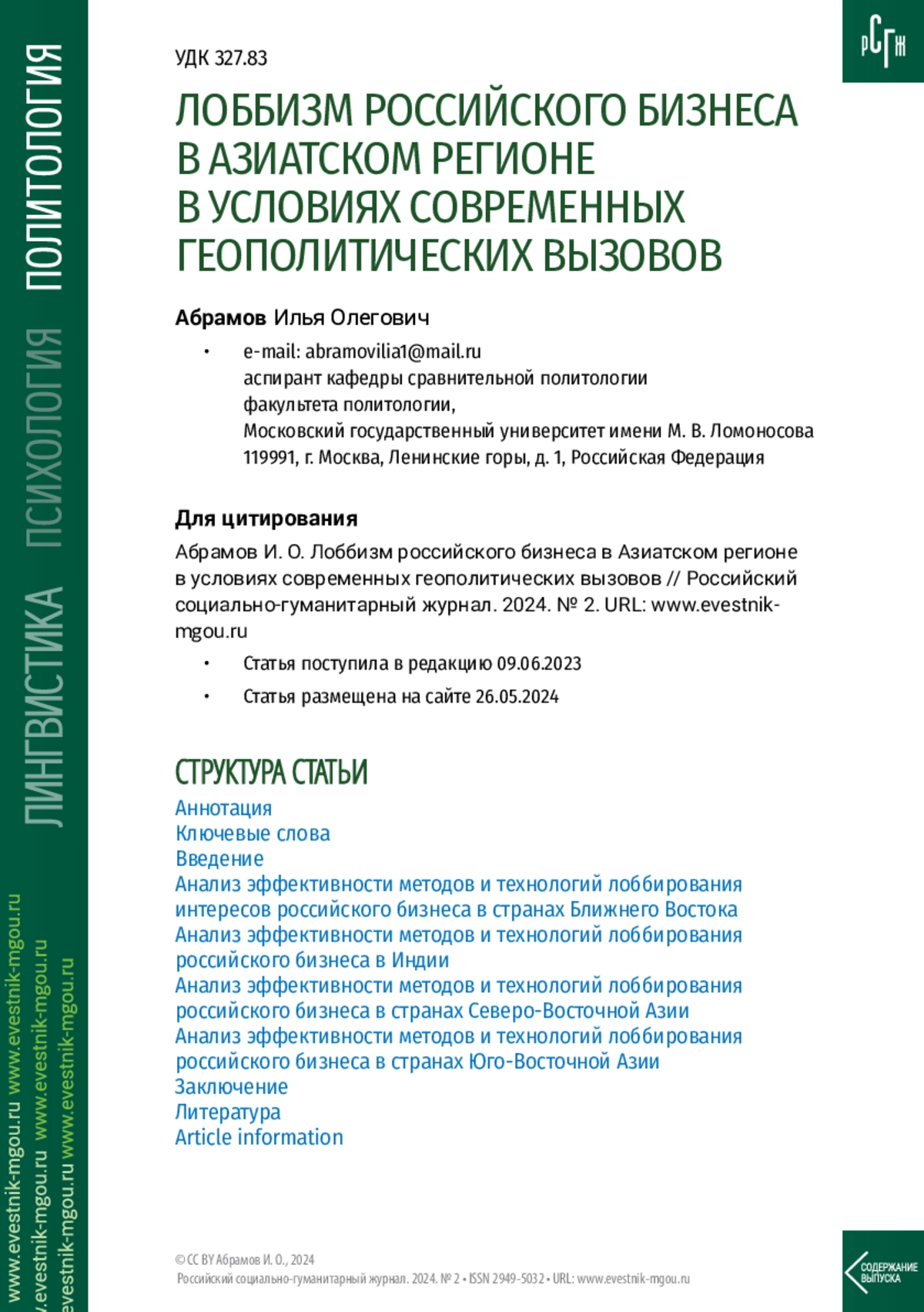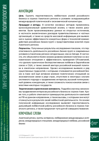 Цель. Оценить перспективность лоббистских усилий российского бизнеса в странах Азиатского региона в условиях складывающейся международной политической и экономической конъюнктуры.