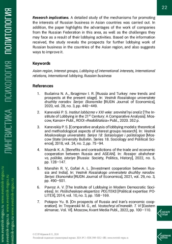 Теоретическая и практическая значимость. Подробно изучены механизмы продвижения интересов российского бизнеса в странах Азии. Кроме того, в работе отмечаются преимущества деятельности компаний из РФ на данном направлении, а также вызовы, с которыми они могут столкнуться в результате своей лоббистской деятельности. На основе полученной информации исследование выявляет перспективность дальнейшей лоббистской работы российского бизнеса в странах Азиатского региона, а также предлагает пути для её совершенствования.