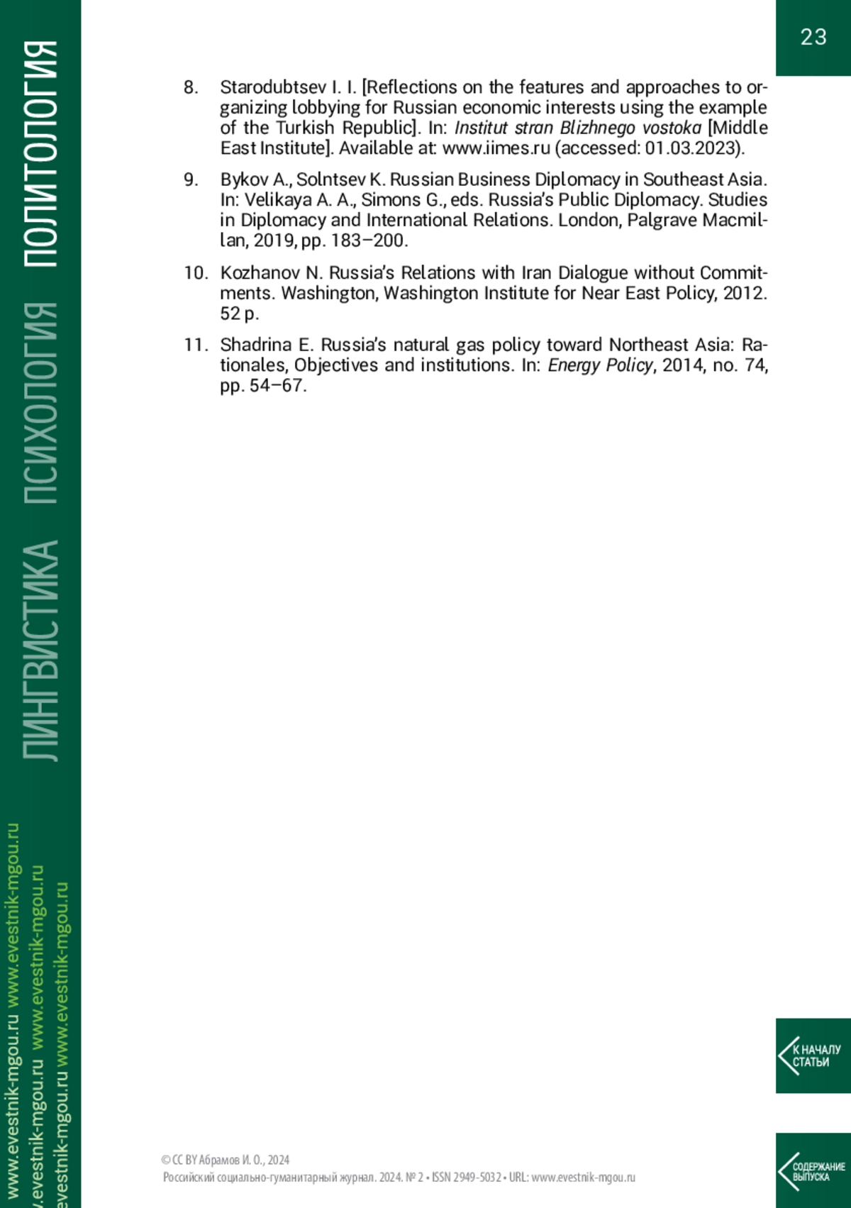 11. Shadrina E. Russia’s natural gas policy toward Northeast Asia: Rationales, Objectives and institutions // Energy Policy. 2014. № 74. P. 54-67.