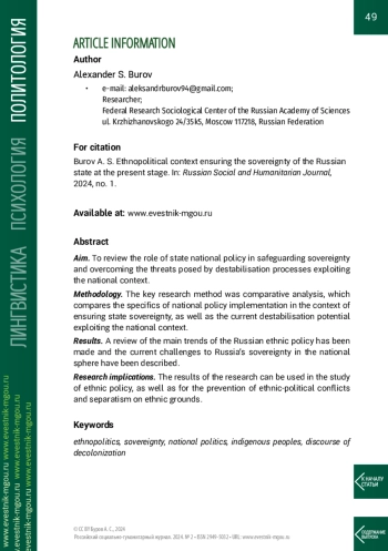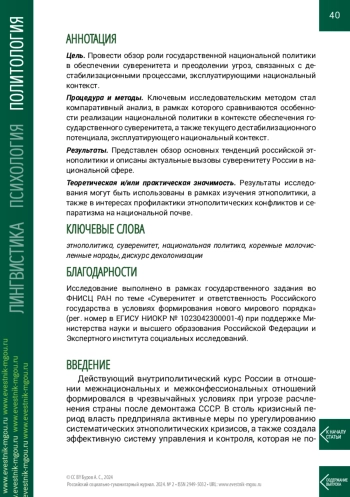 Цель. Провести обзор роли государственной национальной политики в обеспечении суверенитета и преодолении угроз, связанных с дестабилизационными процессами, эксплуатирующими национальный контекст.