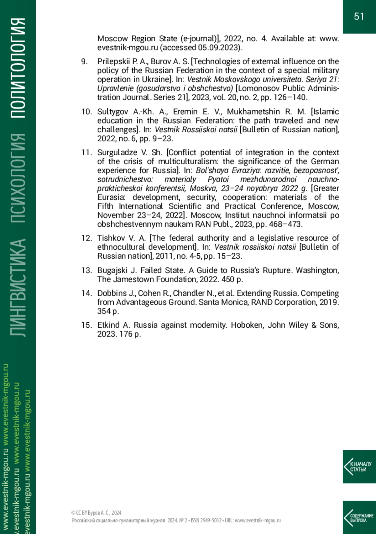 7. Прилепский П. А., Буров А. С. Технологии внешнего влияния на политику Российской Федерации в контексте специальной военной операции на Украине // Вестник Московского университета. Серия 21: Управление (государство и общество). 2023. Т. 20. № 2. С. 126-140.